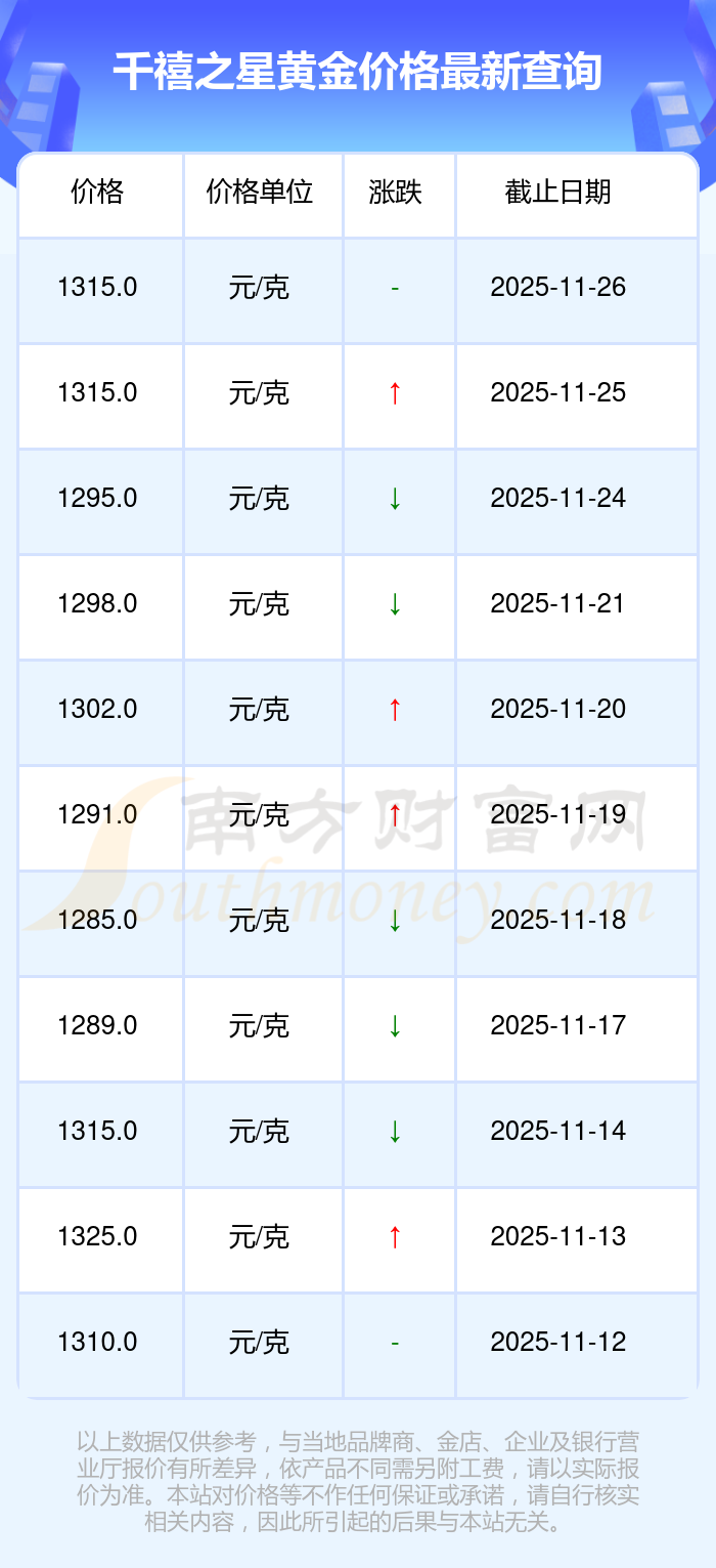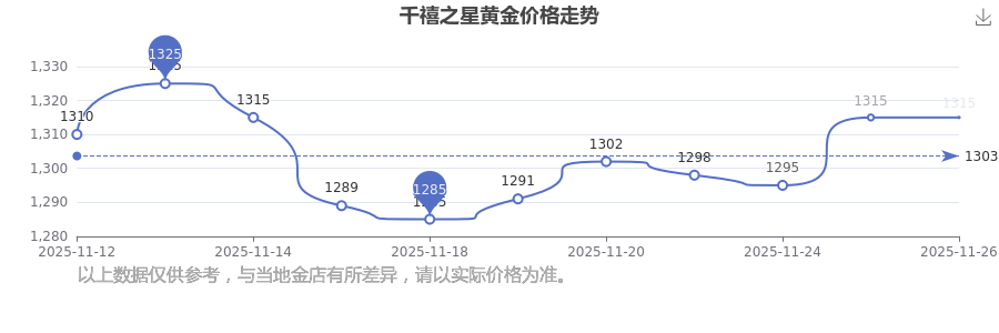 最新數(shù)據(jù)表明,千禧之星今日 黃金價(jià)格為1315.0元/克。