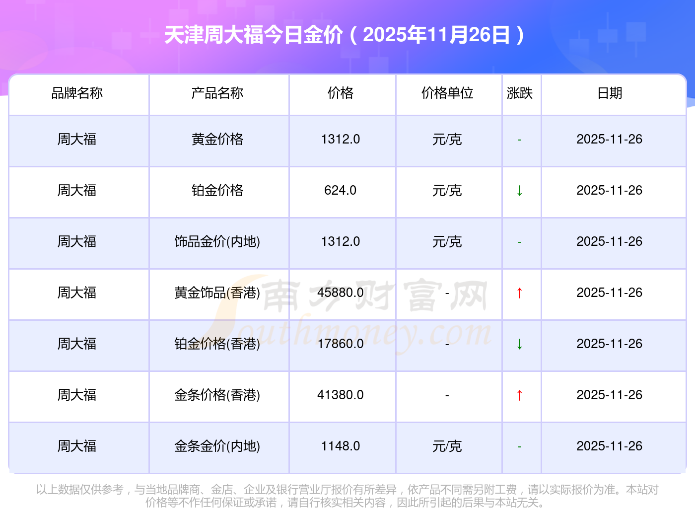 2025年11月26日天津周大福黃金一克的市場(chǎng)行情價(jià)是多少?金條金價(jià)(內(nèi)地)1155.0元/克,黃金價(jià)格1312.0元/克,鉑金價(jià)格624.0元/克,黃金價(jià)格1312.0元/克,鉑金價(jià)格624.0元/克,黃金價(jià)格1315.0元/克,鉑金價(jià)格600.0元/克,黃金價(jià)格1258.0元/克,鉑金價(jià)格368.0元/克,黃金價(jià)格1149.0元/克,鉑金價(jià)格489.0元/克。