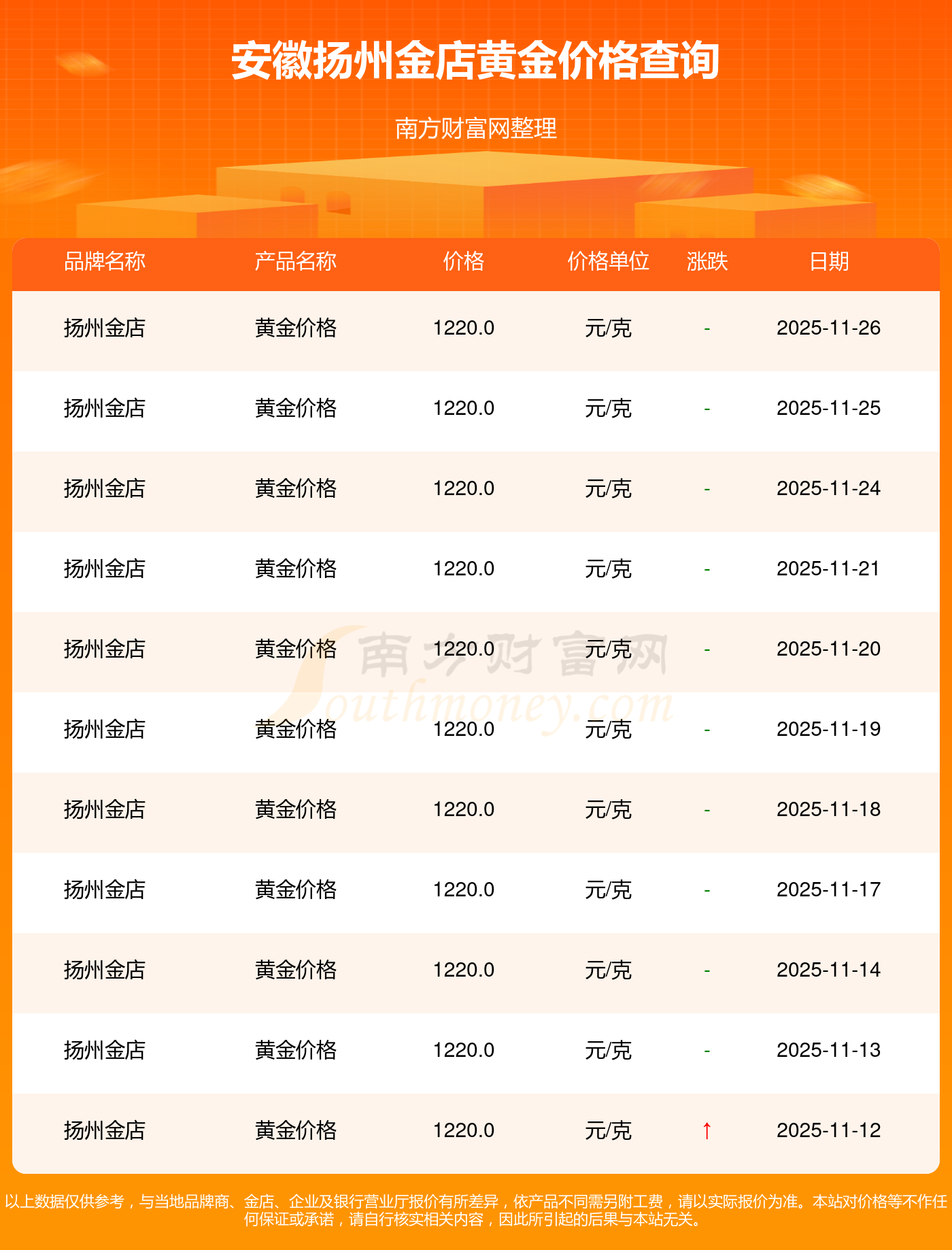 今日(2025年11月26日),1220.0元/克是安徽揚州金店黃金價格的價格標(biāo)準(zhǔn)。