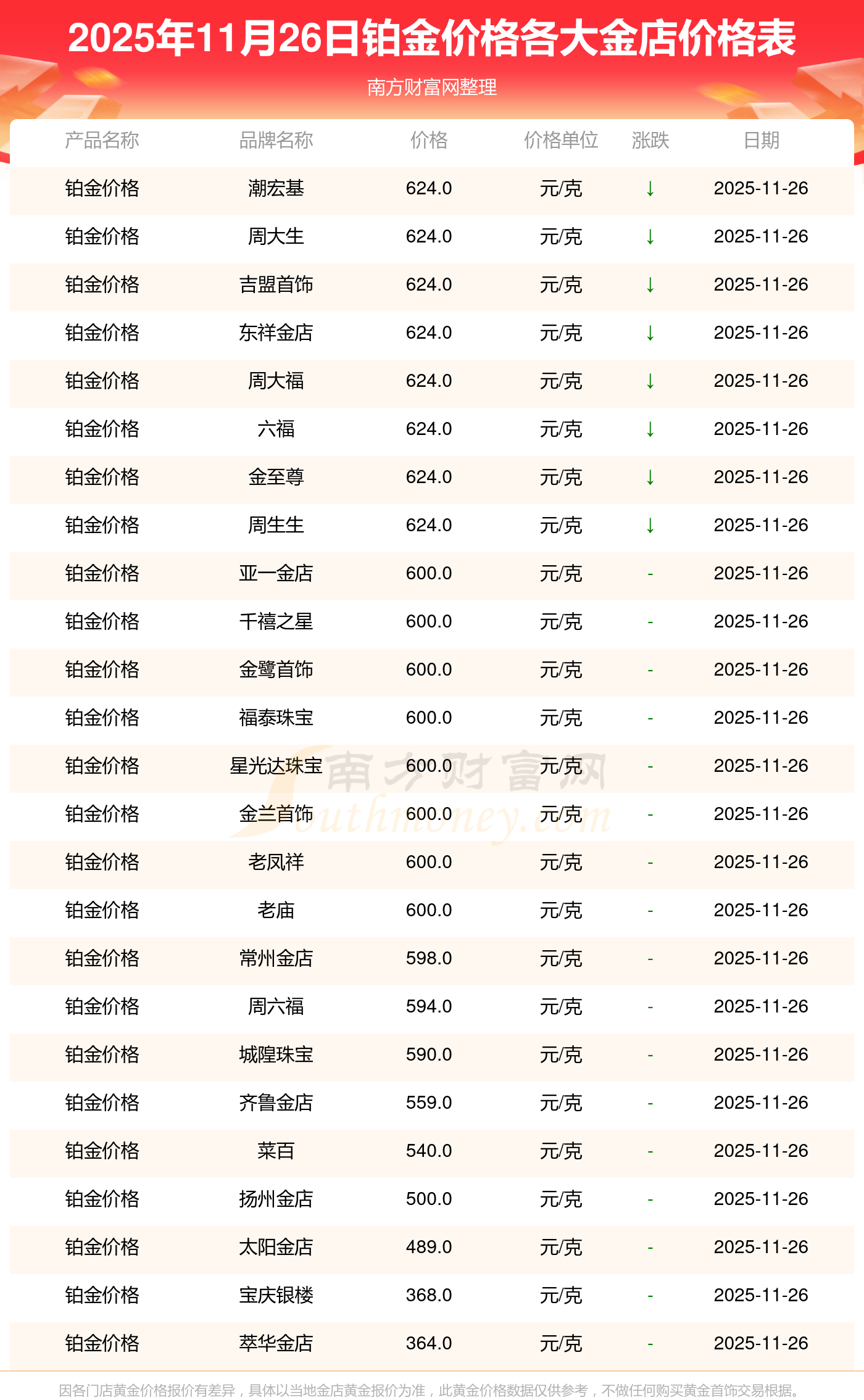 今天是2025年11月26日,周生生、潮宏基、潮宏基、周大生、周大生、亞一金店、亞一金店、寶慶銀樓、寶慶銀樓、太陽(yáng)金店、太陽(yáng)金店等各大金店品牌鉑金價(jià)格最新價(jià)格如下:周生生1155.0元/克、潮宏基1312.0元/克、潮宏基624.0元/克、周大生1312.0元/克、周大生624.0元/克、亞一金店1315.0元/克、亞一金店600.0元/克、寶慶銀樓1258.0元/克、寶慶銀樓368.0元/克、太陽(yáng)金店1149.0元/克、太陽(yáng)金店489.0元/克。