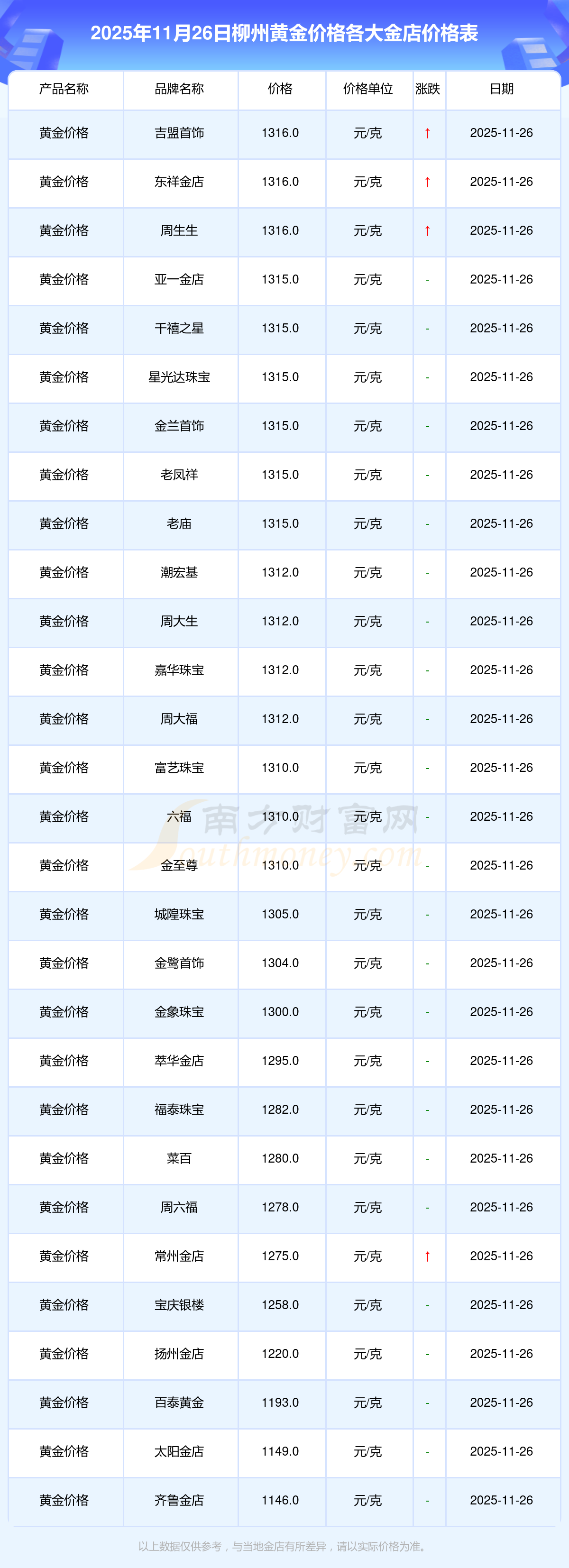 2025年11月26日柳州周生生、潮宏基、潮宏基、周大生、周大生、亞一金店、亞一金店、寶慶銀樓、寶慶銀樓、太陽(yáng)金店、太陽(yáng)金店等各大金店品牌黃金價(jià)格最新價(jià)格行情來(lái)了,如下:周生生金條金價(jià)(內(nèi)地)1155.0元/克,潮宏基黃金價(jià)格1312.0元/克,潮宏基鉑金價(jià)格624.0元/克,周大生黃金價(jià)格1312.0元/克,周大生鉑金價(jià)格624.0元/克,亞一金店黃金價(jià)格1315.0元/克,亞一金店鉑金價(jià)格600.0元/克,寶慶銀樓黃金價(jià)格1258.0元/克,寶慶銀樓鉑金價(jià)格368.0元/克,太陽(yáng)金店黃金價(jià)格1149.0元/克,太陽(yáng)金店鉑金價(jià)格489.0元/克。