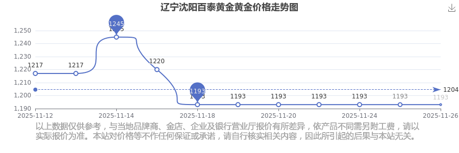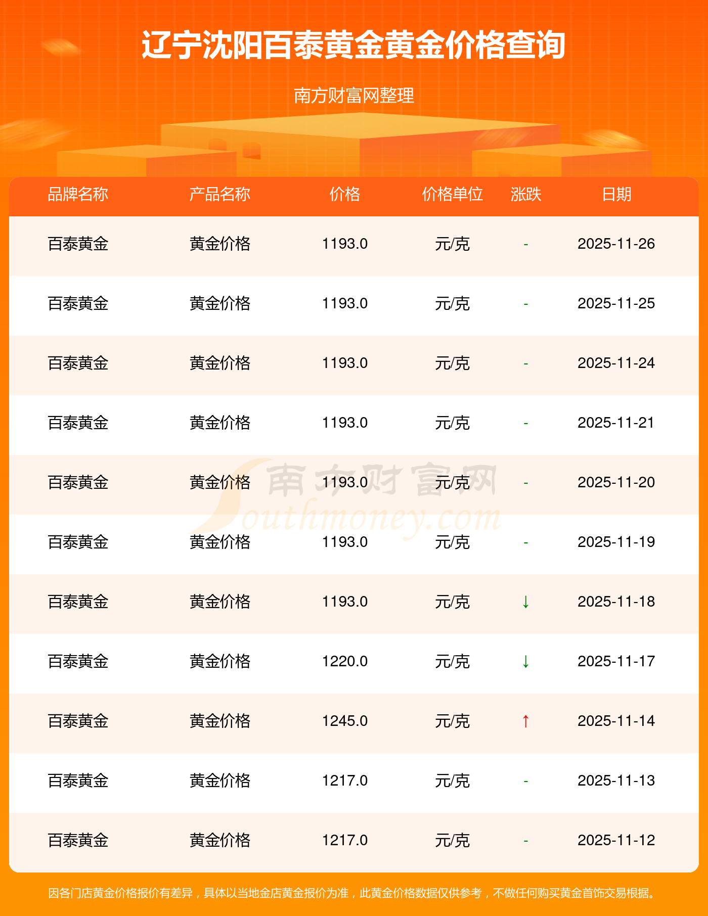 1193.0元/克,這是遼寧沈陽百泰黃金于 2025年11月26日所定的黃金價格。