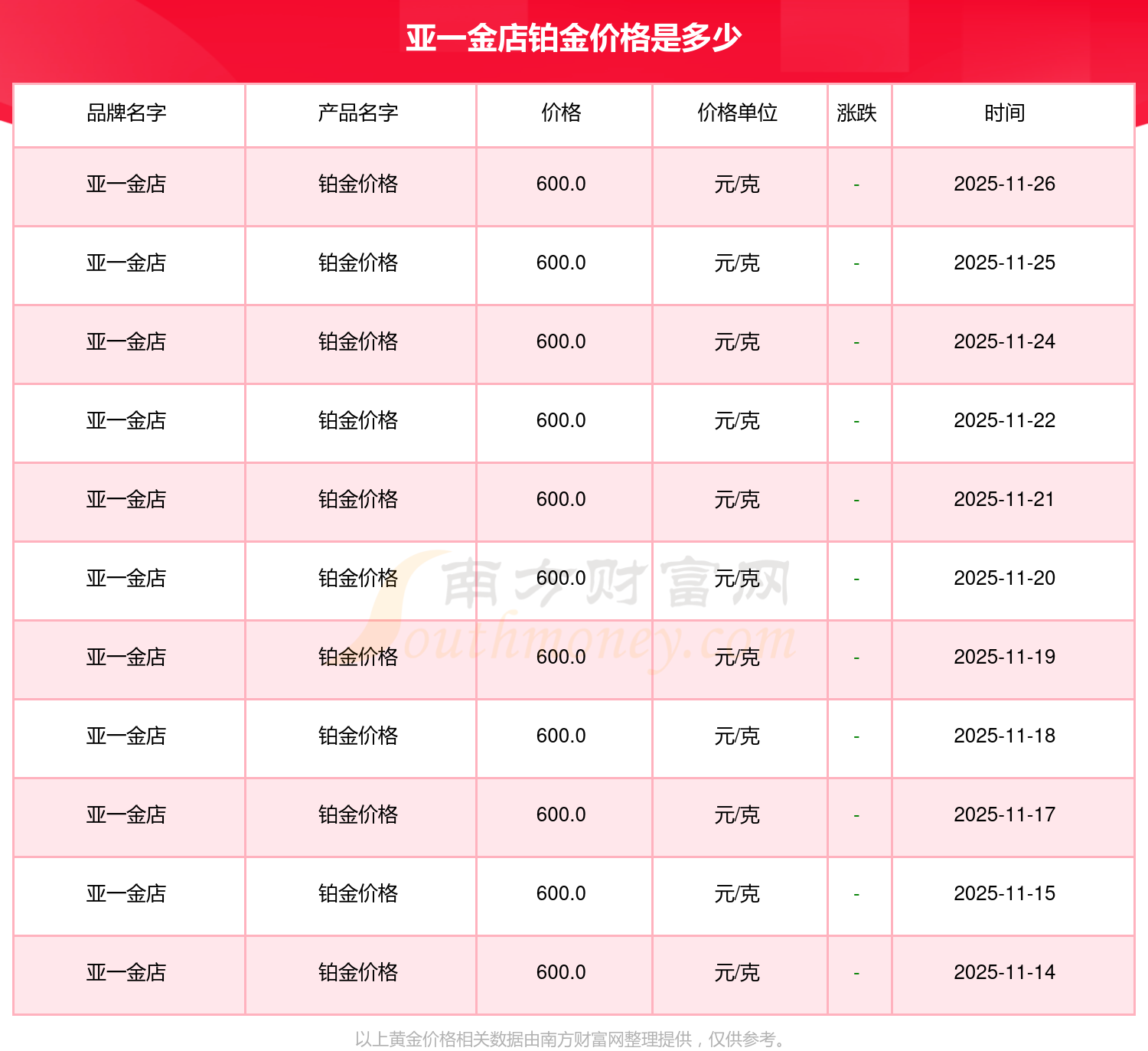 最新數(shù)據(jù)表明,亞一金店今日 鉑金價(jià)格為600.0元/克。