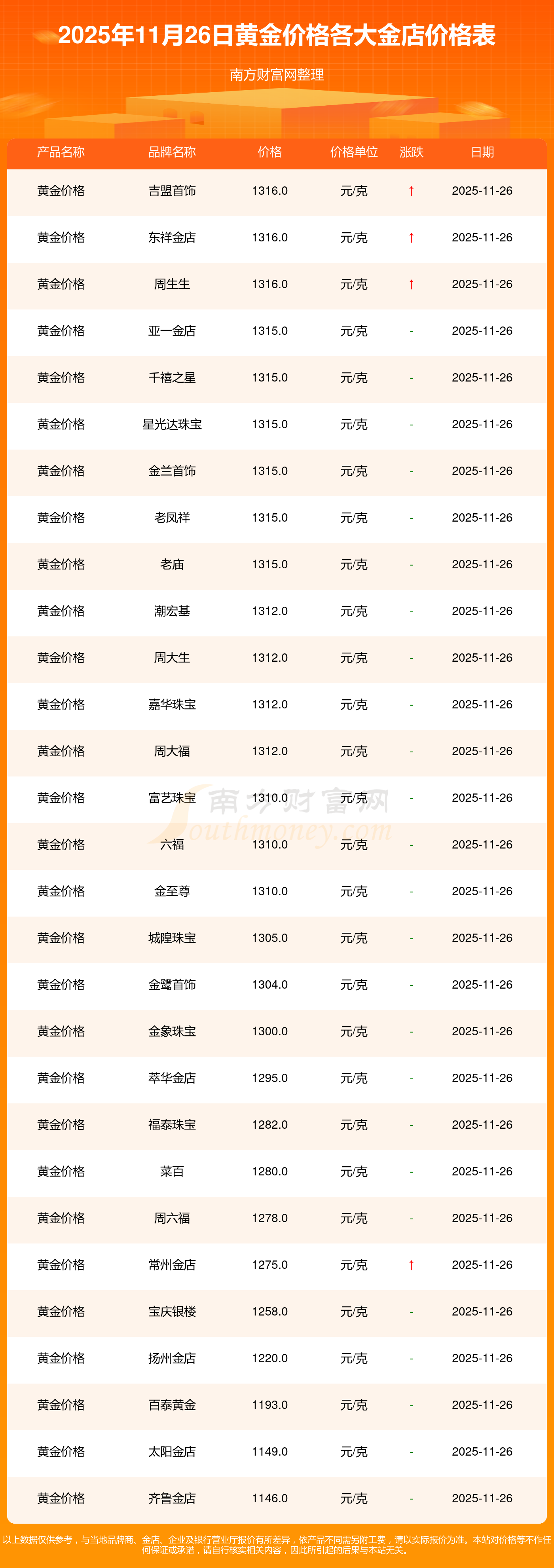 2025年11月26日周生生、潮宏基、潮宏基、周大生、周大生、亞一金店、亞一金店、寶慶銀樓、寶慶銀樓、太陽金店、太陽金店等各大金店品牌黃金價格最新價格如下:周生生金條金價(內(nèi)地)1155.0元/克,潮宏基黃金價格1312.0元/克,潮宏基鉑金價格624.0元/克,周大生黃金價格1312.0元/克,周大生鉑金價格624.0元/克,亞一金店黃金價格1315.0元/克,亞一金店鉑金價格600.0元/克,寶慶銀樓黃金價格1258.0元/克,寶慶銀樓鉑金價格368.0元/克,太陽金店黃金價格1149.0元/克,太陽金店鉑金價格489.0元/克。