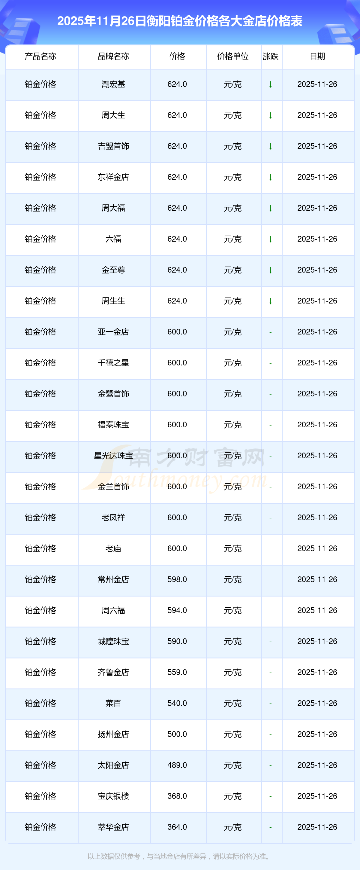 今天是2025年11月26日,衡陽(yáng)周生生、潮宏基、潮宏基、周大生、周大生、亞一金店、亞一金店、寶慶銀樓、寶慶銀樓、太陽(yáng)金店、太陽(yáng)金店等各大金店品牌鉑金價(jià)格最新價(jià)格如下:周生生1155.0元/克、潮宏基1312.0元/克、潮宏基624.0元/克、周大生1312.0元/克、周大生624.0元/克、亞一金店1315.0元/克、亞一金店600.0元/克、寶慶銀樓1258.0元/克、寶慶銀樓368.0元/克、太陽(yáng)金店1149.0元/克、太陽(yáng)金店489.0元/克。