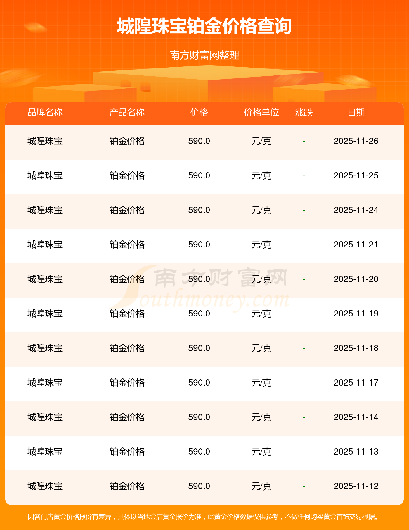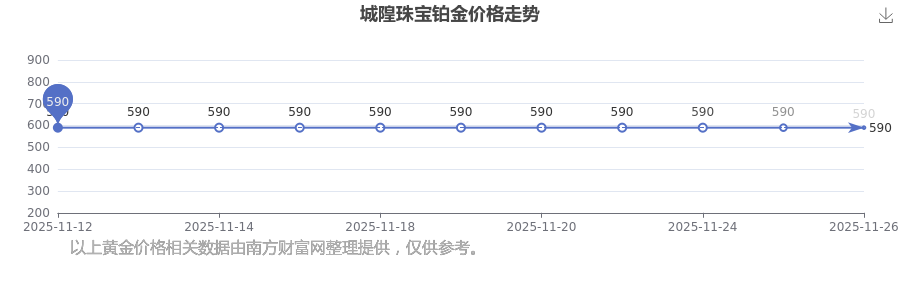 今日城隍珠寶 鉑金價格最新的市場標價為590.0元/克。