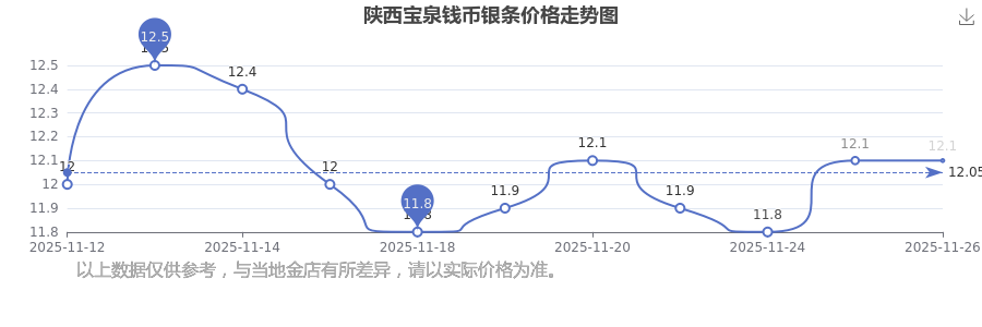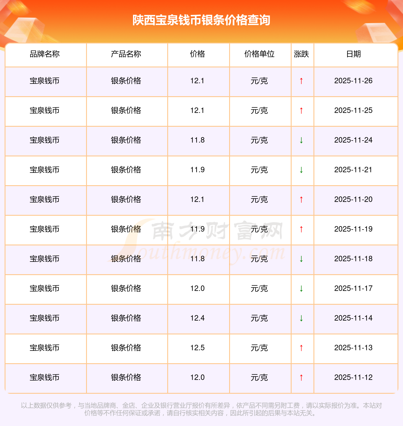 今日(2025年11月26日)陜西寶泉錢幣銀條價(jià)格為12.1元/克。
