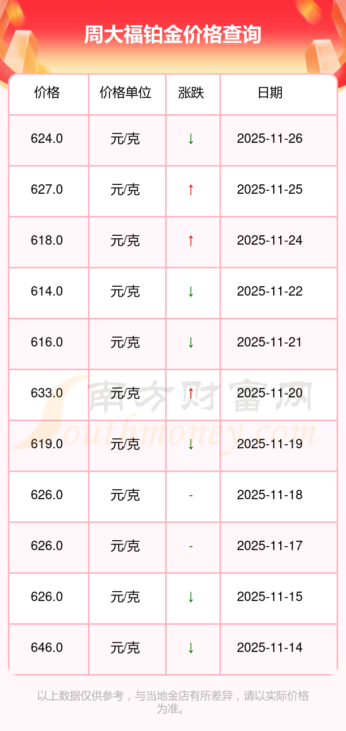今日周大福鉑金價(jià)格最新查詢:624.0元/克。