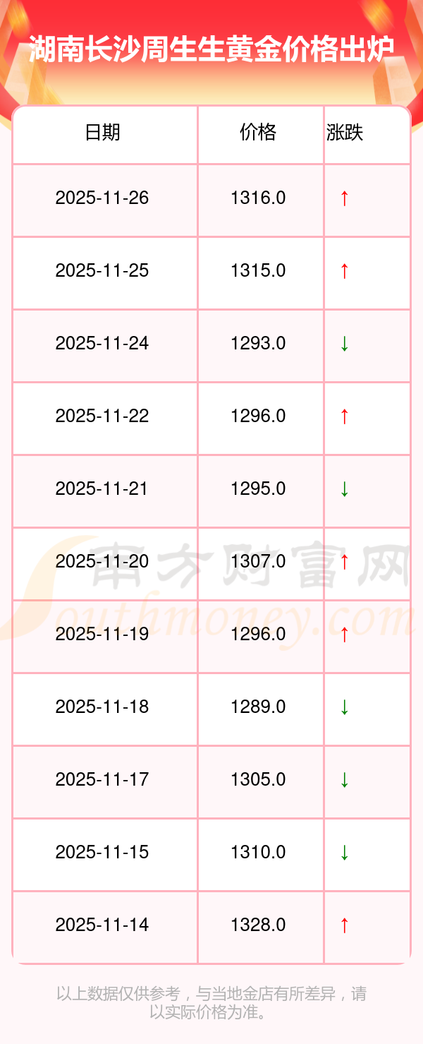湖南長沙周生生的黃金價(jià)格在今日(2025年11月26日),每克售價(jià)為1316.0元/克。
