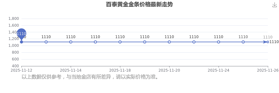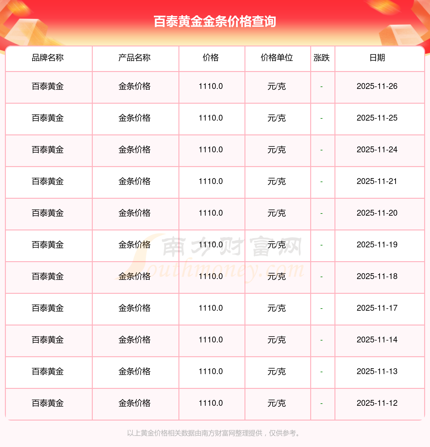 今日百泰黃金所公布的 金條價格最新價格為1110.0元/克。