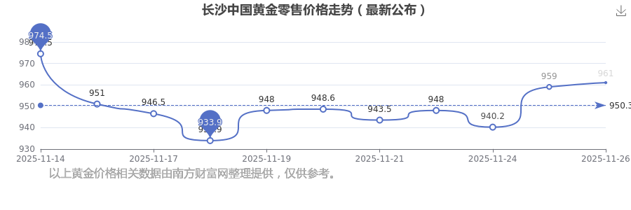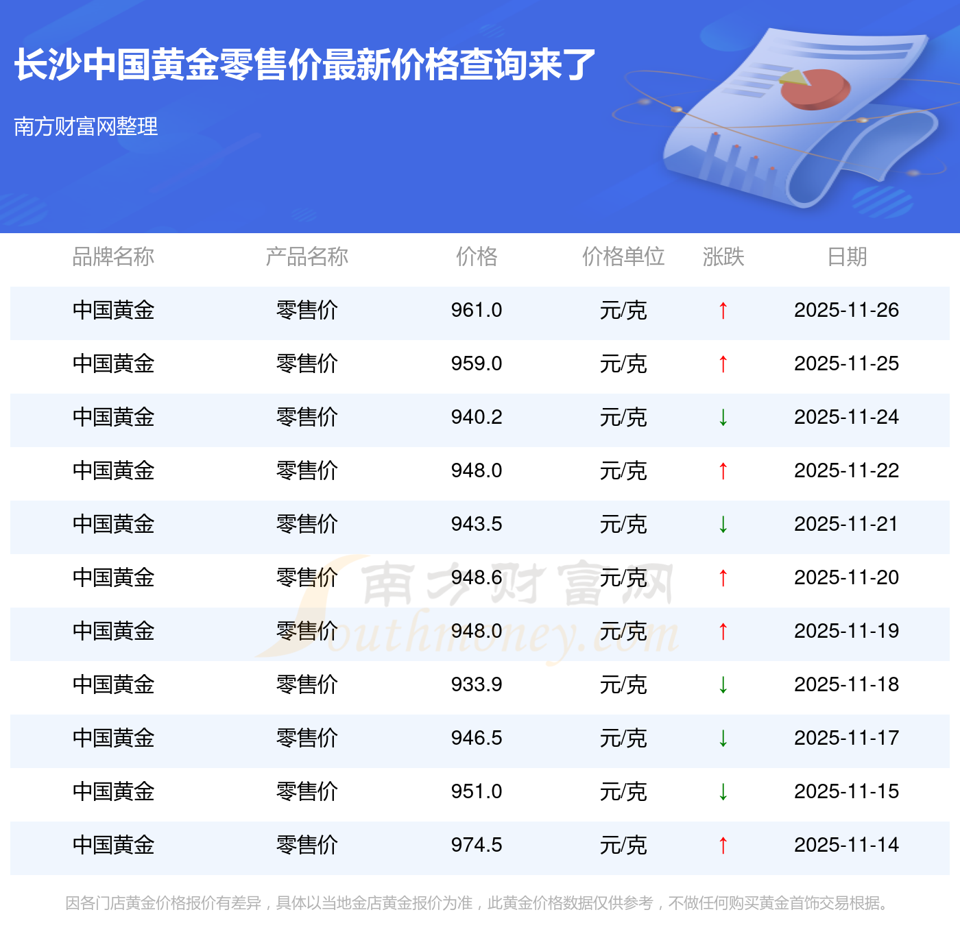 長沙中國黃金零售價格在 2025年11月26日為 961.0元/克。