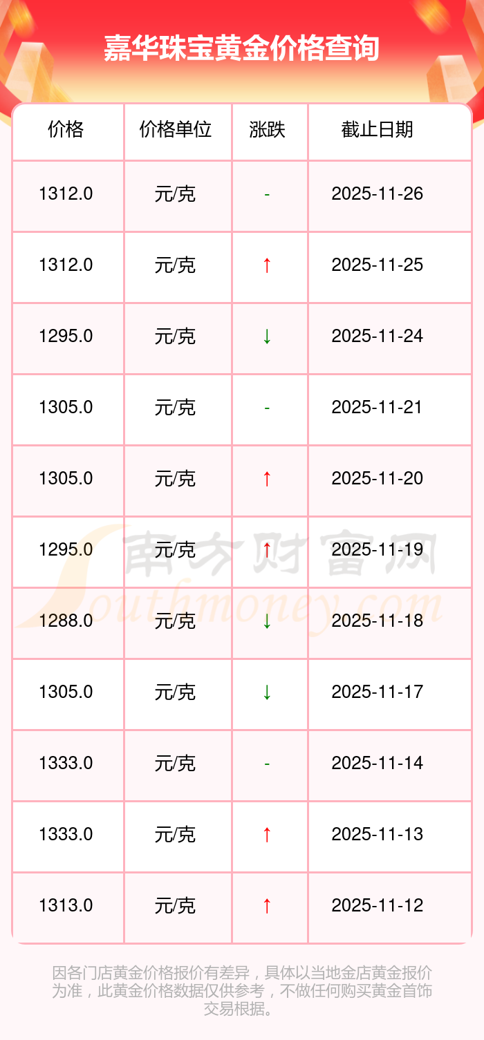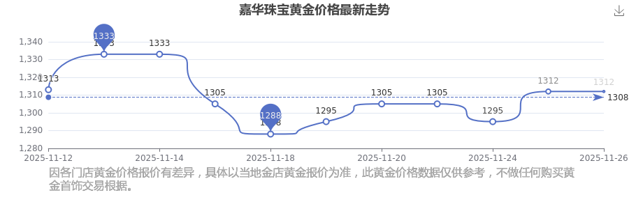 嘉華珠寶今日黃金價格的最新標價為1312.0元/克。