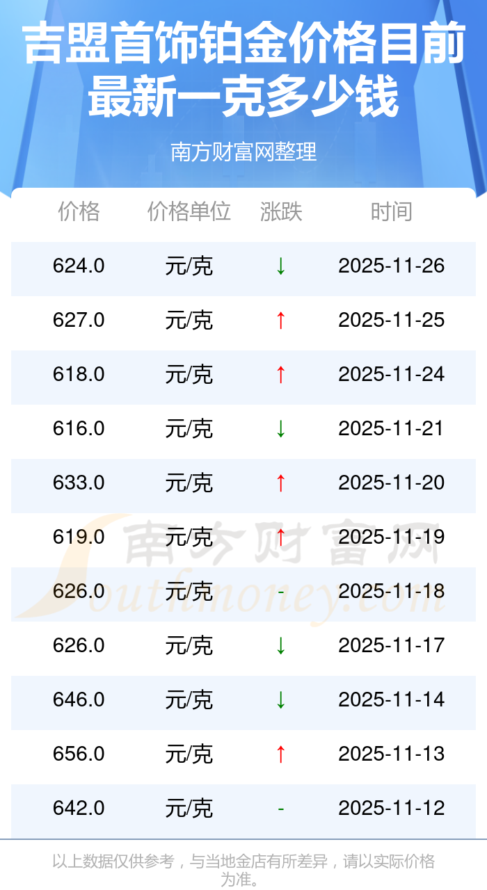 今日吉盟首飾鉑金價(jià)格的價(jià)格是624.0元/克。