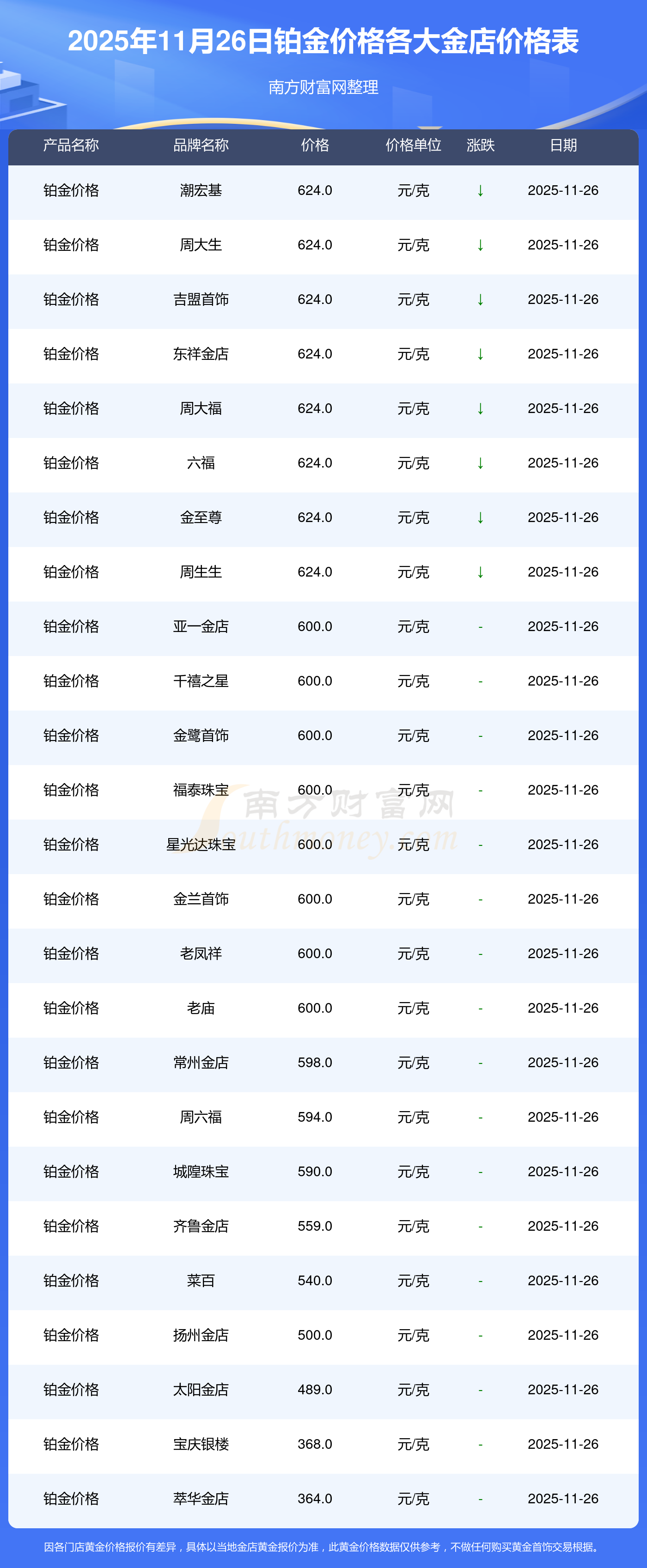 2025年11月26日周生生、潮宏基、潮宏基、周大生、周大生、亞一金店、亞一金店、寶慶銀樓、寶慶銀樓、太陽金店、太陽金店等各大金店品牌鉑金價格最新價格如下:周生生金條金價(內(nèi)地)1155.0元/克,潮宏基黃金價格1312.0元/克,潮宏基鉑金價格624.0元/克,周大生黃金價格1312.0元/克,周大生鉑金價格624.0元/克,亞一金店黃金價格1315.0元/克,亞一金店鉑金價格600.0元/克,寶慶銀樓黃金價格1258.0元/克,寶慶銀樓鉑金價格368.0元/克,太陽金店黃金價格1149.0元/克,太陽金店鉑金價格489.0元/克。