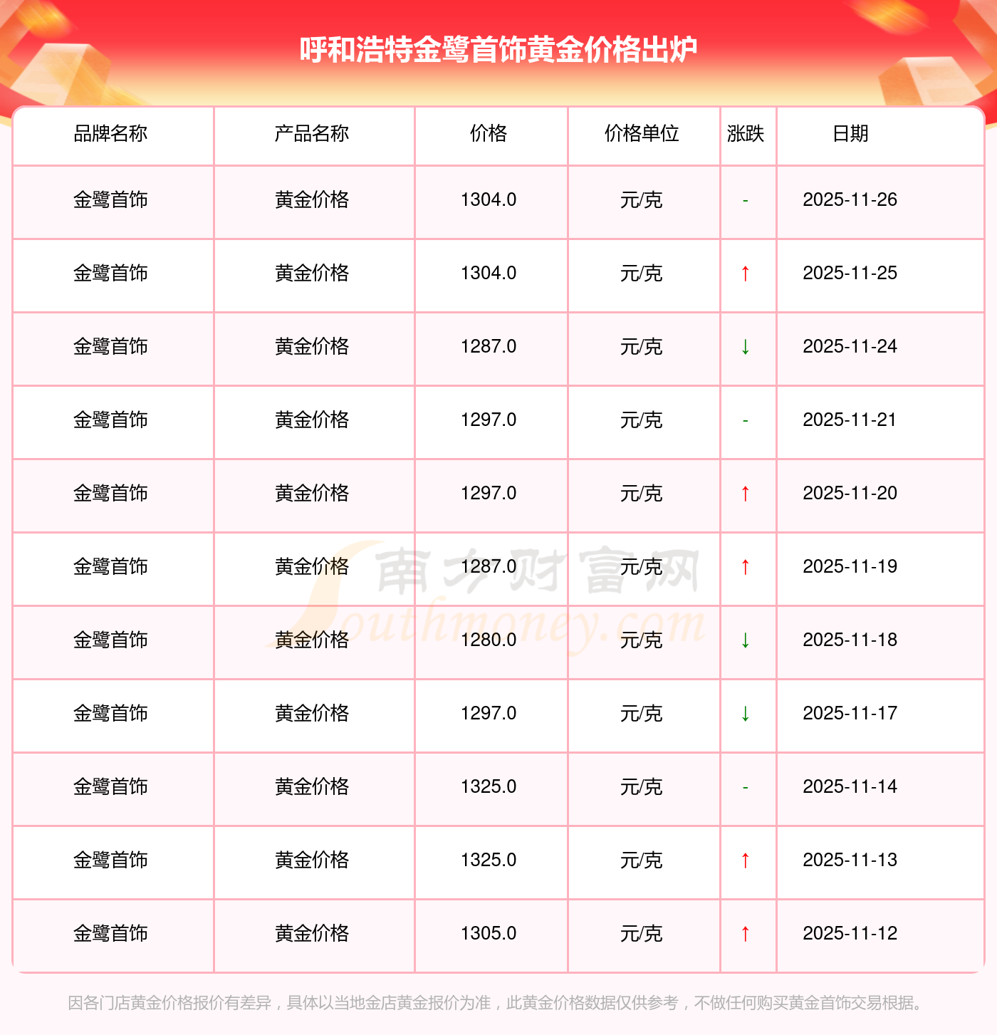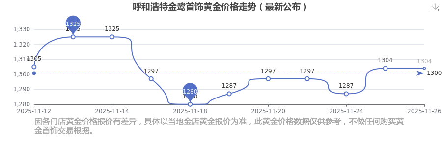 2025年11月26日呼和浩特金鷺首飾黃金價格是1304.0元/克。