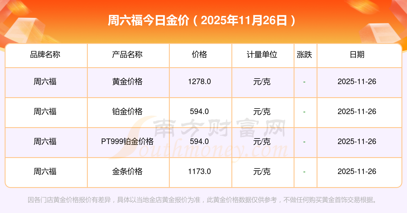 現(xiàn)在周六福黃金價格是多少錢1克_2025年周六福今日金價是多少錢一克,最新周六福查詢,2025年11月26日周六福PT999鉑金價格現(xiàn)在每克多少錢?最新周六福PT999鉑金價格報價公布,一起來看看吧!