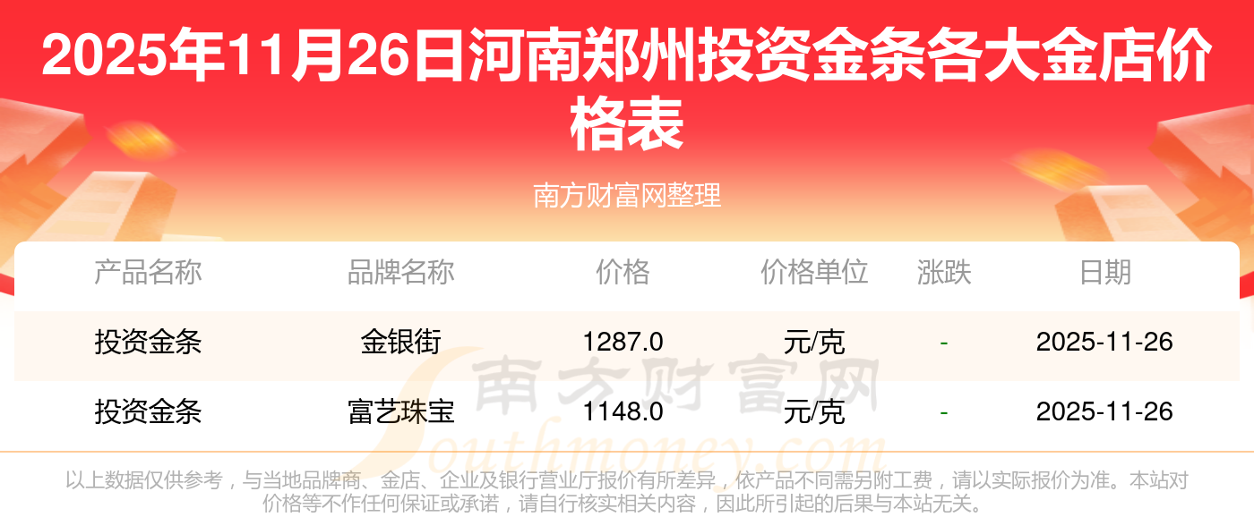 今日河南鄭州投資金條最低的金店是富藝珠寶,報價1148.0元/克,最高的是金銀街,報價1287.0元/克。今日投資金條高低差為139元/克。