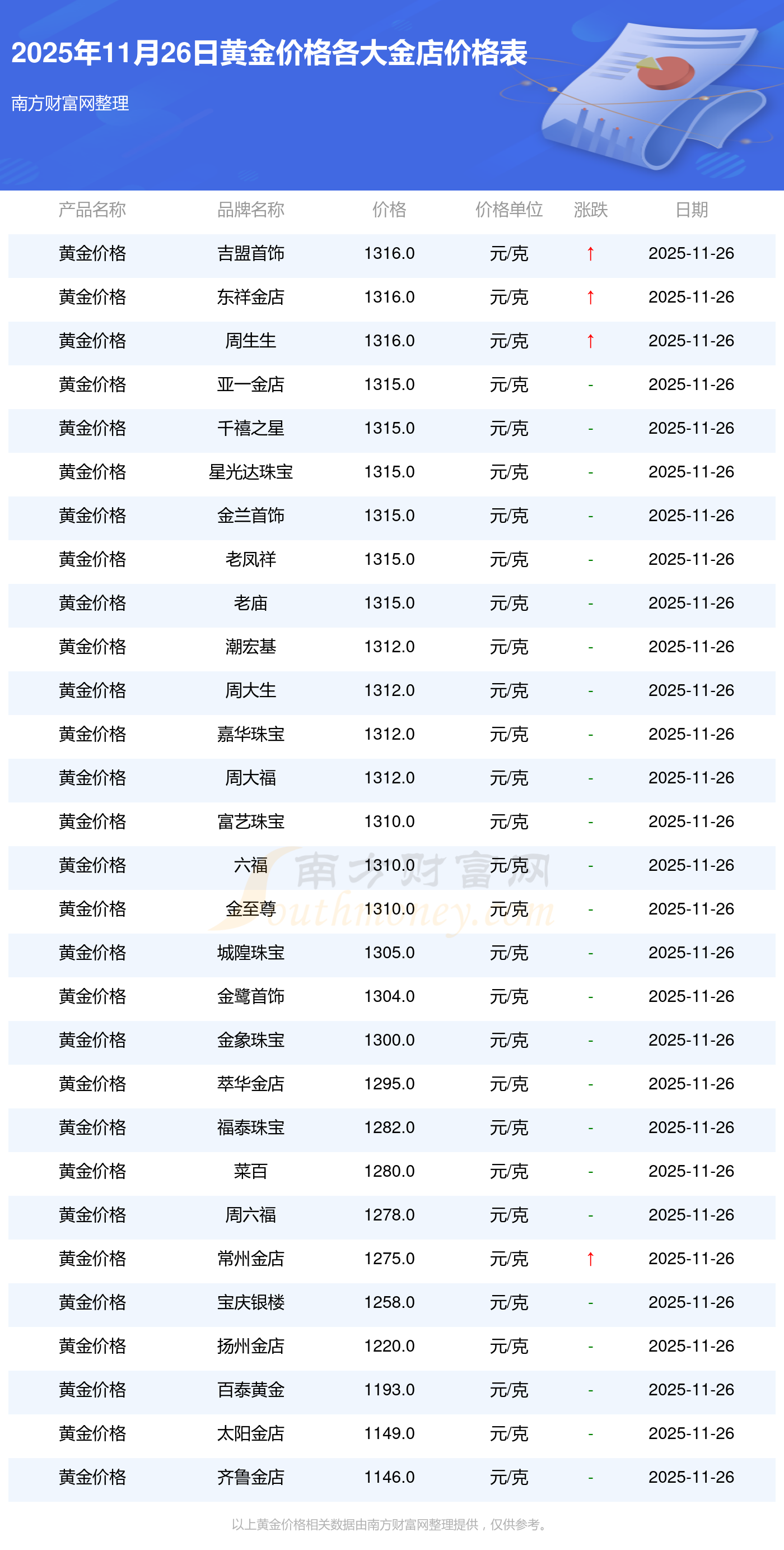 2025年11月26日各大金店黃金價(jià)格最新價(jià)格:周生生1155.0元/克,潮宏基1312.0元/克,潮宏基624.0元/克,周大生1312.0元/克,周大生624.0元/克,亞一金店1315.0元/克,亞一金店600.0元/克,寶慶銀樓1258.0元/克,寶慶銀樓368.0元/克,太陽(yáng)金店1149.0元/克,太陽(yáng)金店489.0元/克。