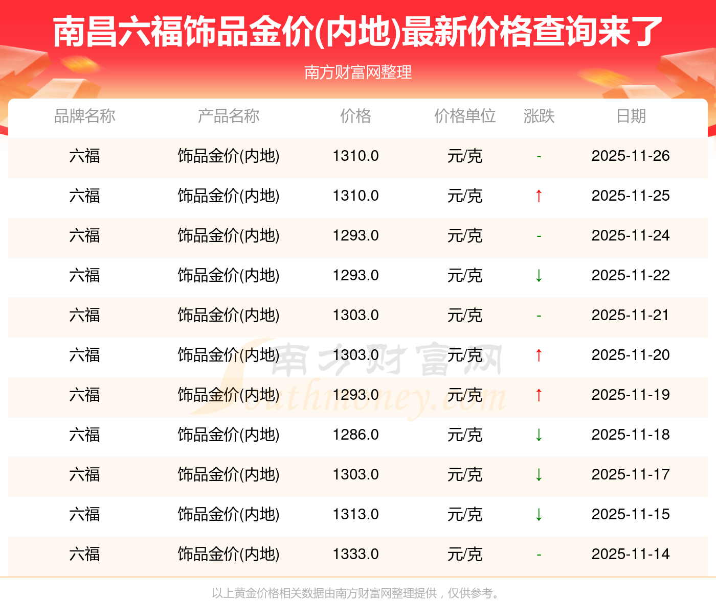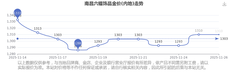 今日2025年11月26日,南昌六福飾品金價(內(nèi)地)為1310.0元/克。