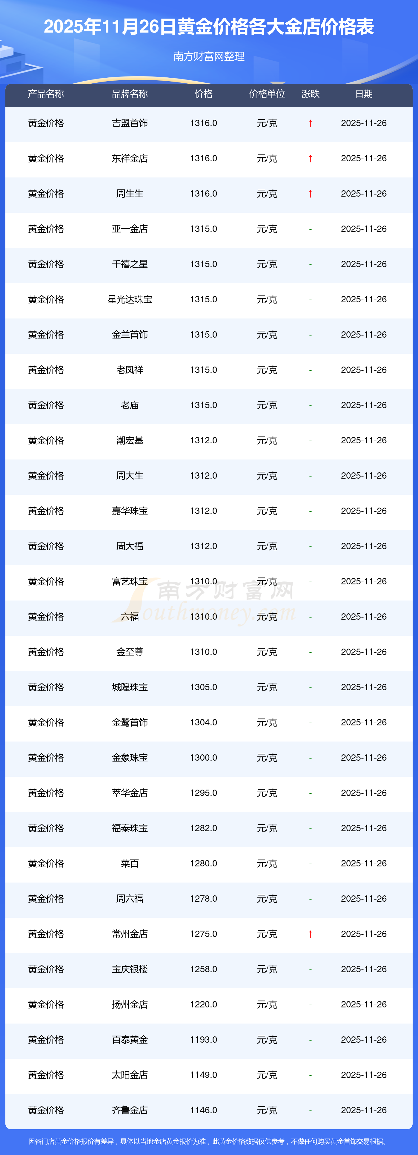 今天是2025年11月26日,周生生、潮宏基、潮宏基、周大生、周大生、亞一金店、亞一金店、寶慶銀樓、寶慶銀樓、太陽(yáng)金店、太陽(yáng)金店等各大金店品牌黃金價(jià)格最新價(jià)格如下:周生生1155.0元/克、潮宏基1312.0元/克、潮宏基624.0元/克、周大生1312.0元/克、周大生624.0元/克、亞一金店1315.0元/克、亞一金店600.0元/克、寶慶銀樓1258.0元/克、寶慶銀樓368.0元/克、太陽(yáng)金店1149.0元/克、太陽(yáng)金店489.0元/克。