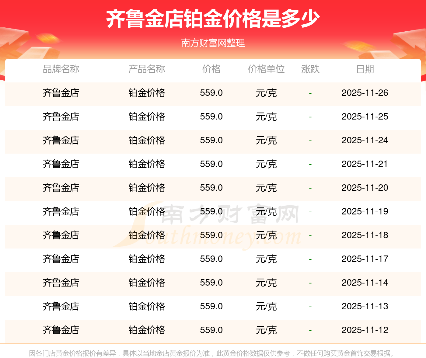 目前齊魯金店 鉑金價格的價格,今日最新為559.0元/克。