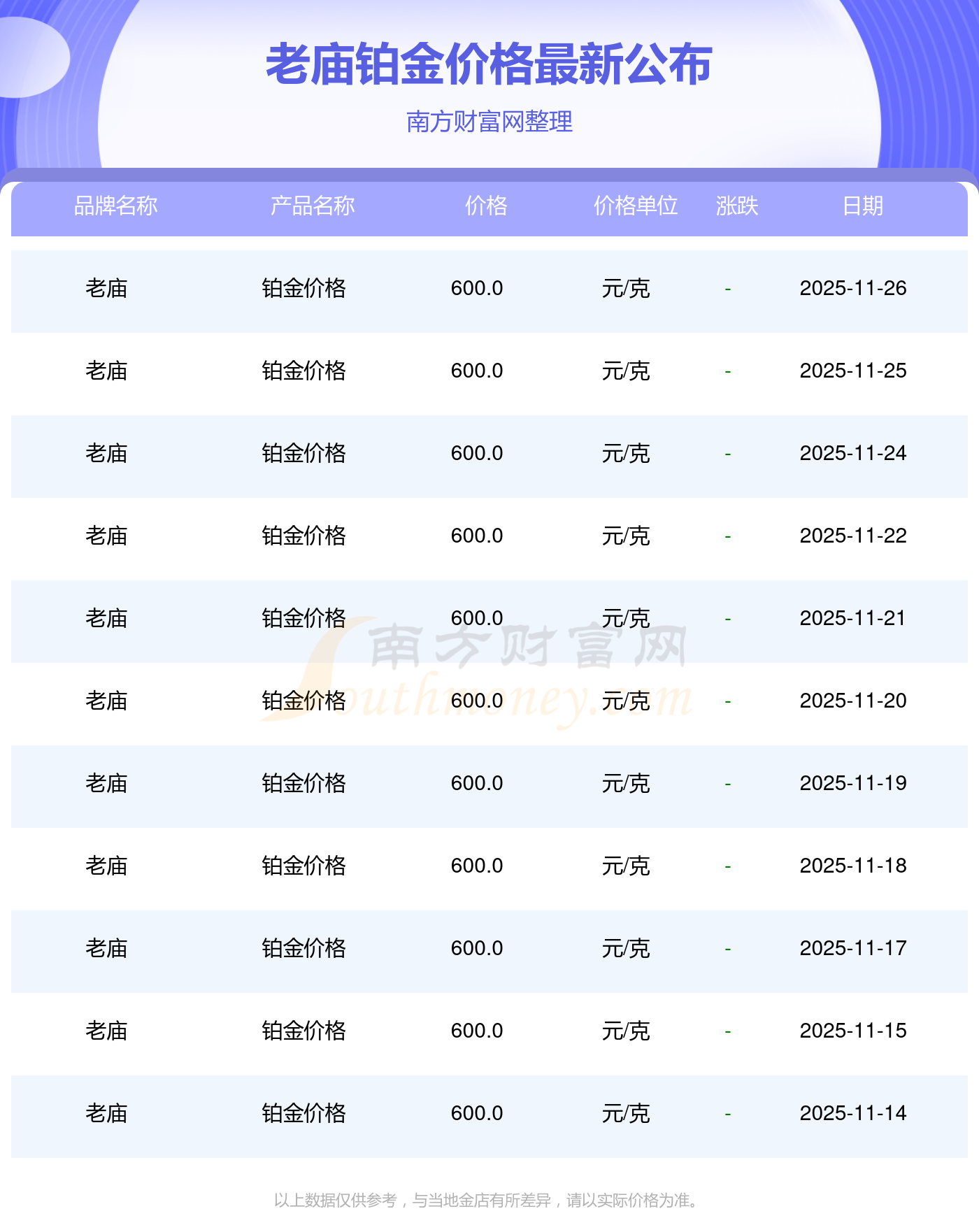今日老廟鉑金價(jià)格為600.0元/克。