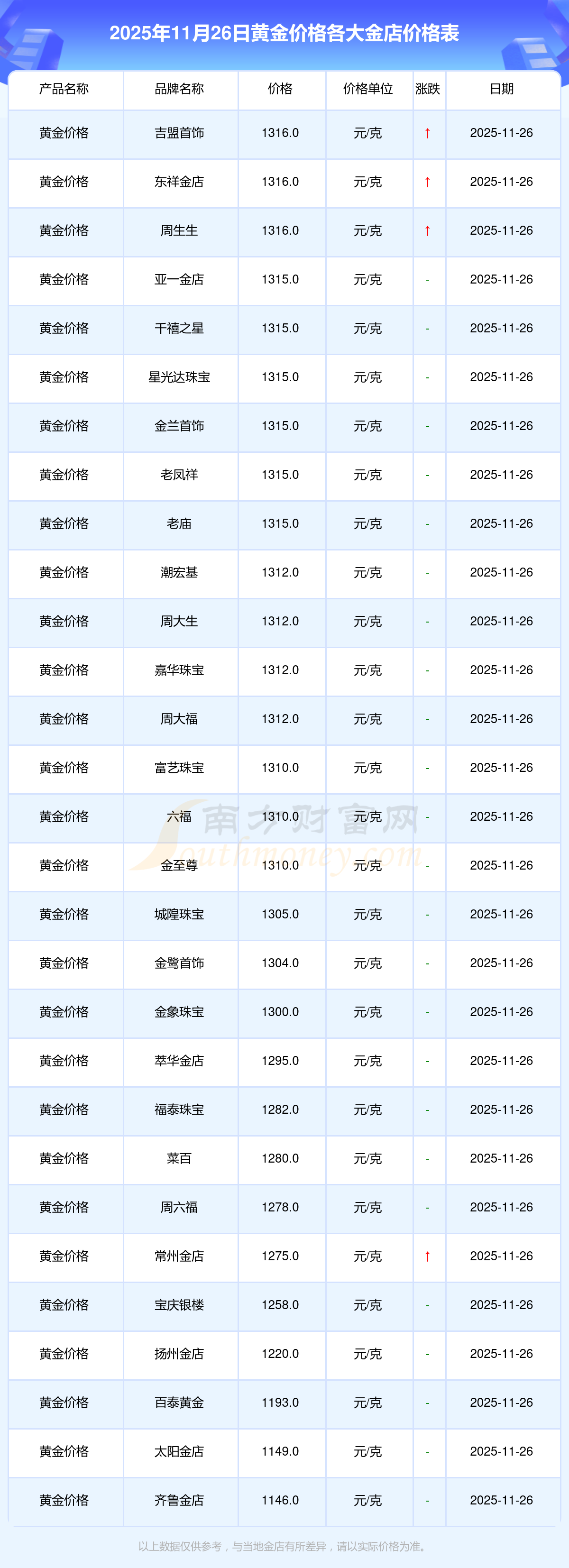 2025年11月26日各大金店黃金價(jià)格最新價(jià)格:周生生1155.0元/克,潮宏基1312.0元/克,潮宏基624.0元/克,周大生1312.0元/克,周大生624.0元/克,亞一金店1315.0元/克,亞一金店600.0元/克,寶慶銀樓1258.0元/克,寶慶銀樓368.0元/克,太陽(yáng)金店1149.0元/克,太陽(yáng)金店489.0元/克。