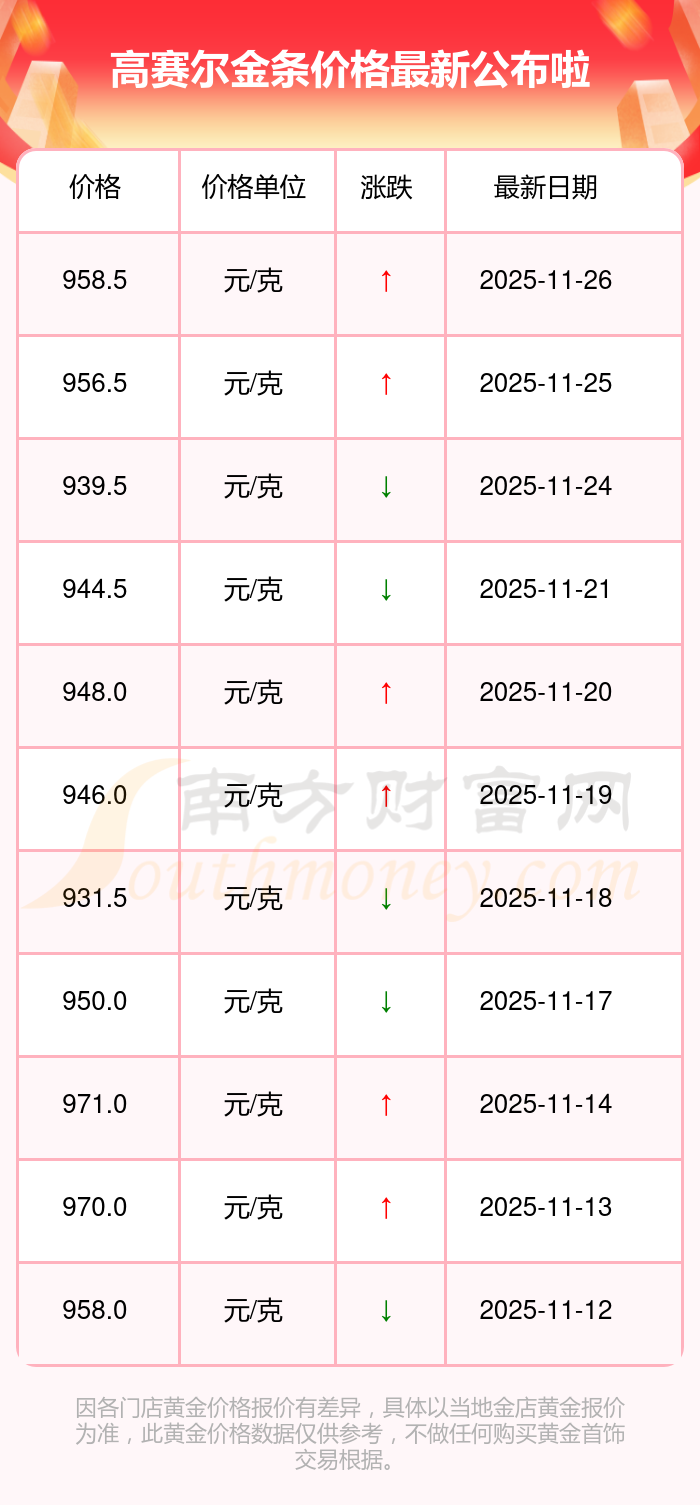 2025年11月26日高賽爾金條價(jià)格最新為958.5元/克。