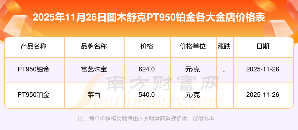 2025年11月26日,圖木舒克周生生、潮宏基、潮宏基、周大生、周大生、亞一金店、亞一金店、寶慶銀樓、寶慶銀樓、太陽金店、太陽金店等各大金店品牌PT950鉑金今日價格如下:周生生1155.0元/克、潮宏基1312.0元/克、潮宏基624.0元/克、周大生1312.0元/克、周大生624.0元/克、亞一金店1315.0元/克、亞一金店600.0元/克、寶慶銀樓1258.0元/克、寶慶銀樓368.0元/克、太陽金店1149.0元/克、太陽金店489.0元/克。