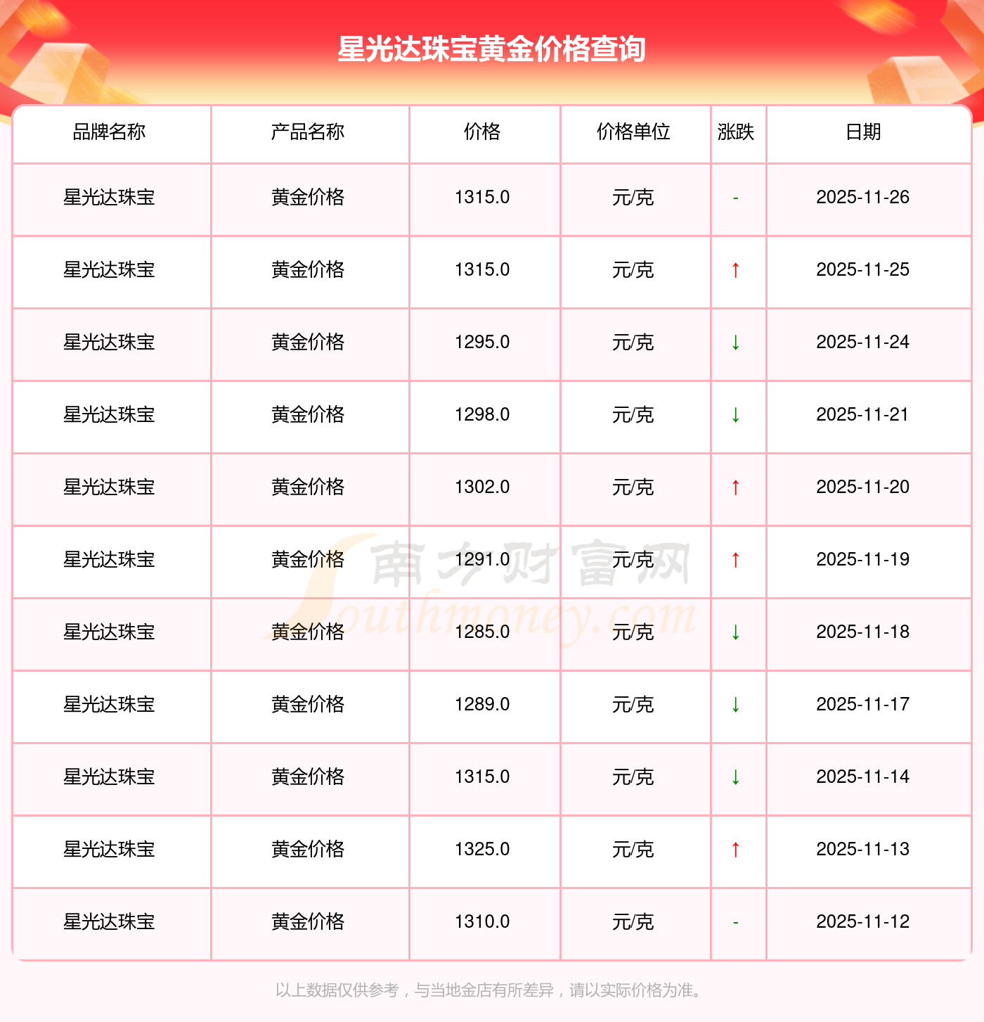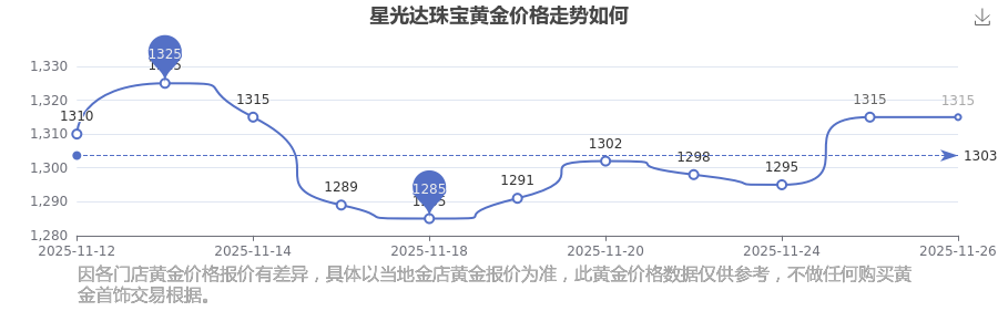 今日(2025年11月26日)星光達(dá)珠寶黃金價(jià)格:1315.0元/克。