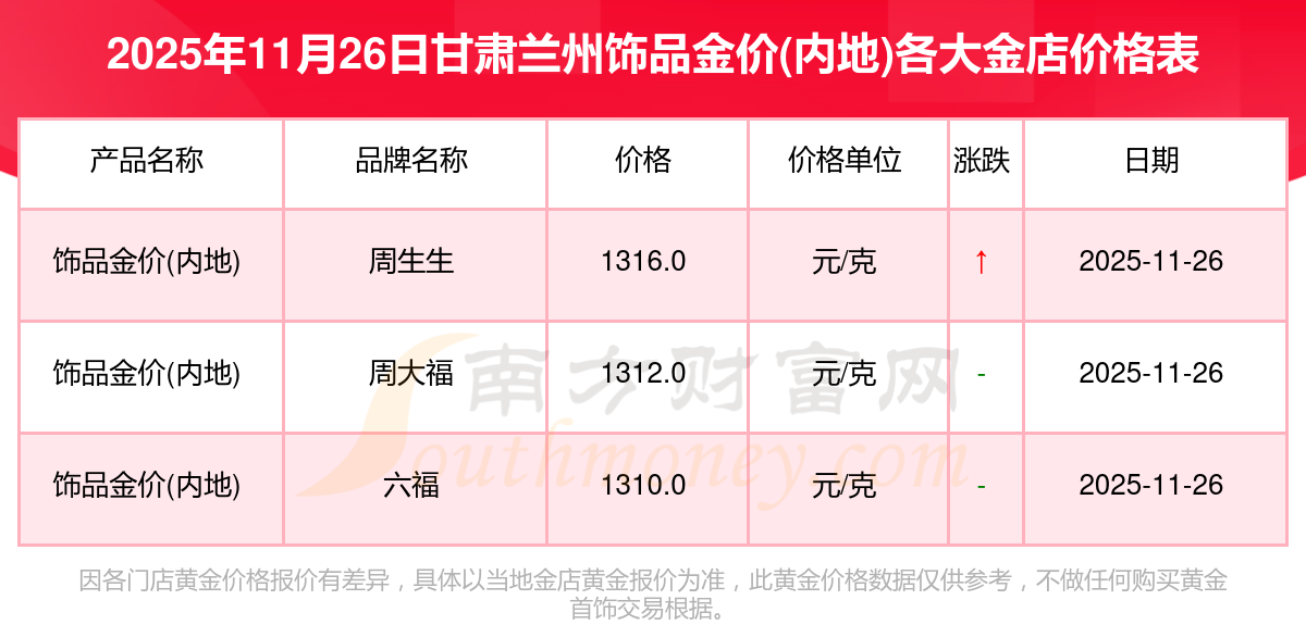 一、2025年11月26日甘肅蘭州各大金店飾品金價(內(nèi)地)一克多少錢_飾品金價(內(nèi)地)今天價格查詢