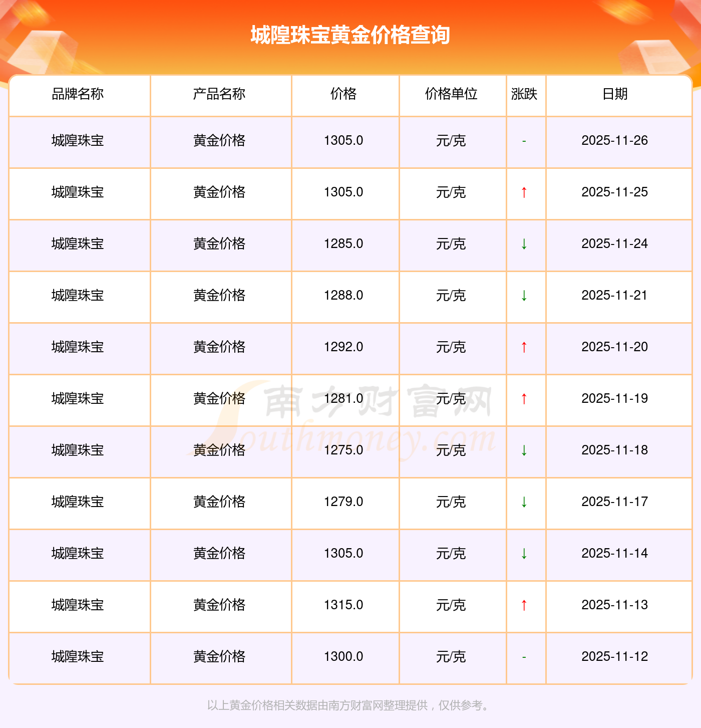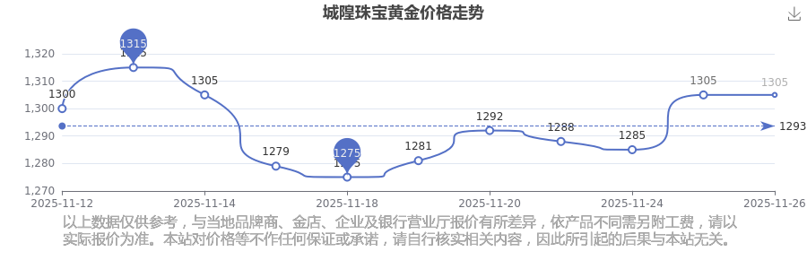 城隍珠寶今日黃金價格的最新標價為1305.0元/克。