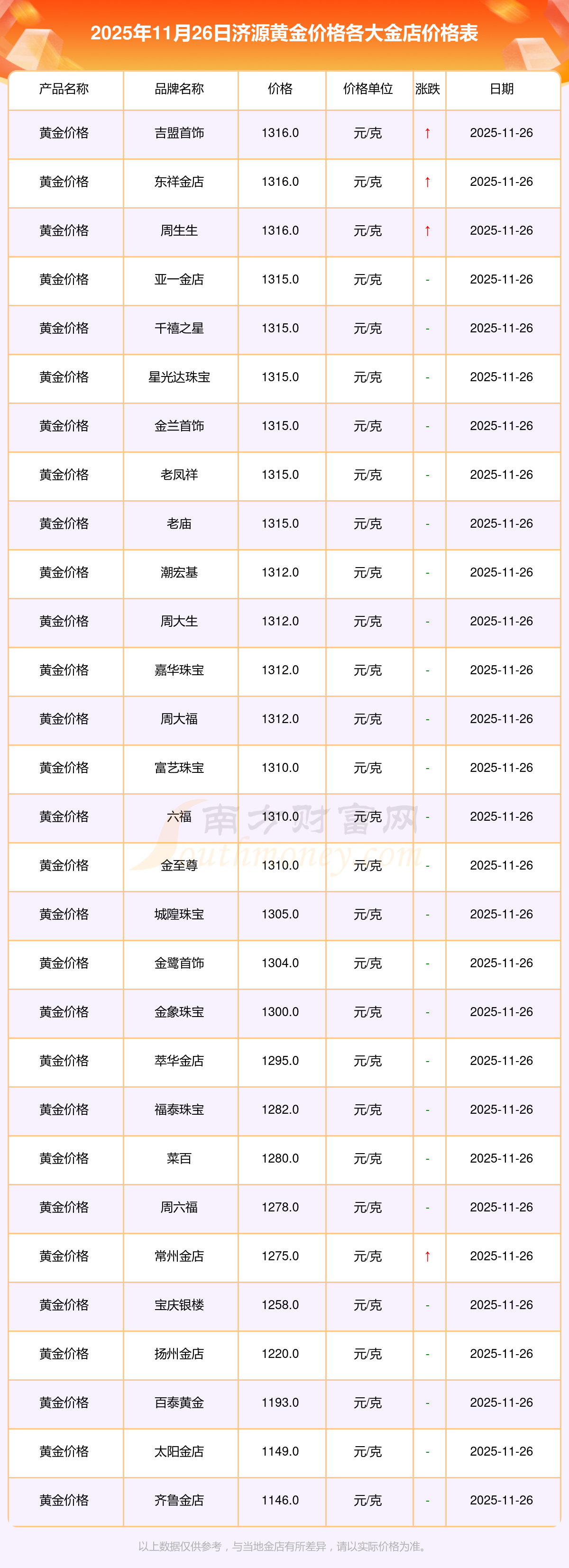 2025年11月26日,濟源周生生、潮宏基、潮宏基、周大生、周大生、亞一金店、亞一金店、寶慶銀樓、寶慶銀樓、太陽金店、太陽金店等各大金店品牌黃金價格今日價格行情最新來了:周生生1155.0元/克、潮宏基1312.0元/克、潮宏基624.0元/克、周大生1312.0元/克、周大生624.0元/克、亞一金店1315.0元/克、亞一金店600.0元/克、寶慶銀樓1258.0元/克、寶慶銀樓368.0元/克、太陽金店1149.0元/克、太陽金店489.0元/克。