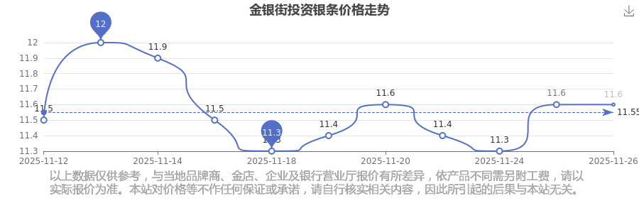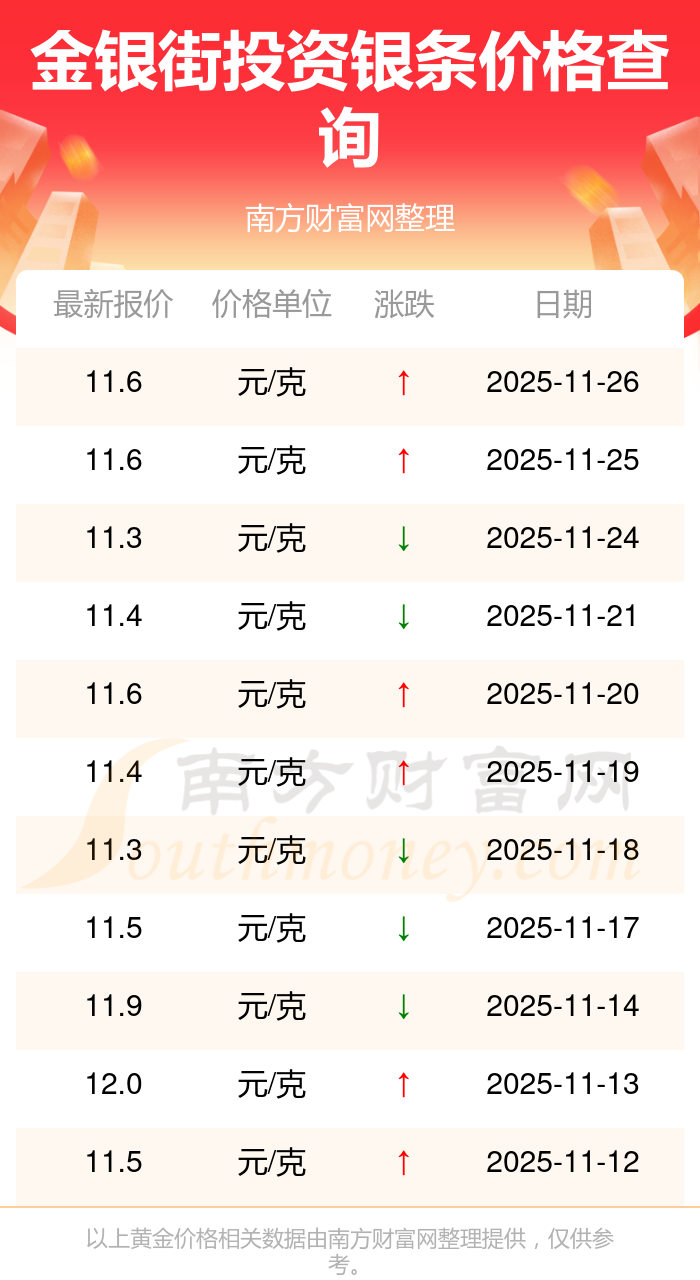 今日(2025年11月26日),金銀街投資銀條價格:11.6元/克。
