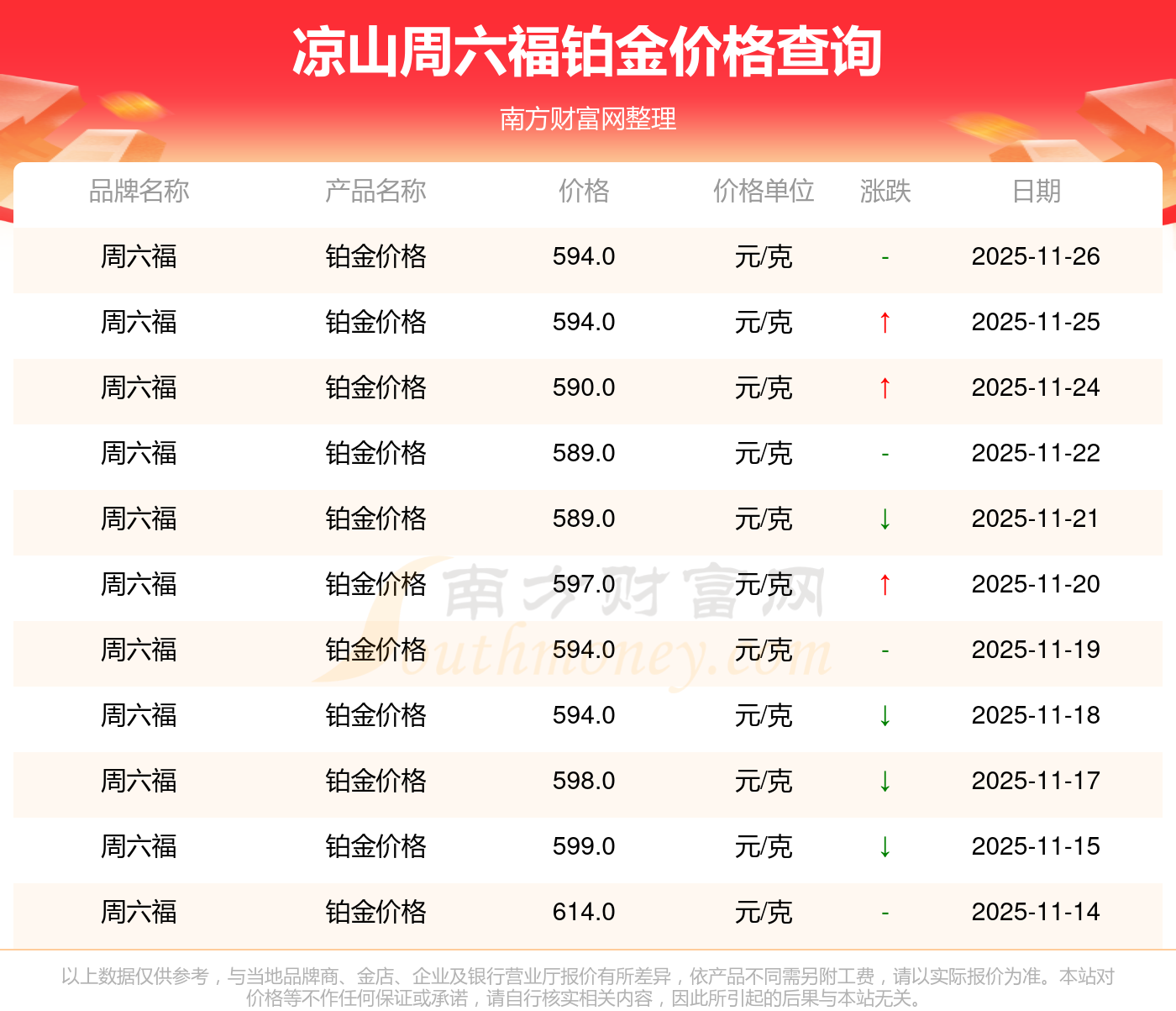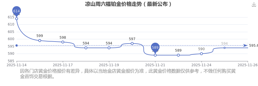 今日(2025年11月26日),涼山周六福鉑金價格每克的價值為594.0元/克。