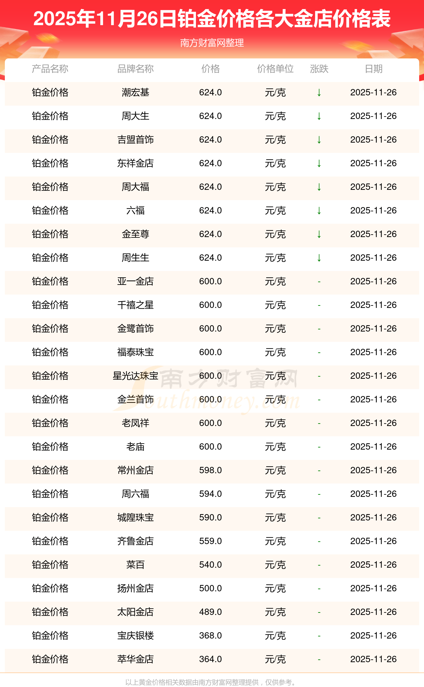 2025年11月26日,周生生、潮宏基、潮宏基、周大生、周大生、亞一金店、亞一金店、寶慶銀樓、寶慶銀樓、太陽金店、太陽金店等各大金店品牌鉑金價格今日價格如下:周生生1155.0元/克、潮宏基1312.0元/克、潮宏基624.0元/克、周大生1312.0元/克、周大生624.0元/克、亞一金店1315.0元/克、亞一金店600.0元/克、寶慶銀樓1258.0元/克、寶慶銀樓368.0元/克、太陽金店1149.0元/克、太陽金店489.0元/克。