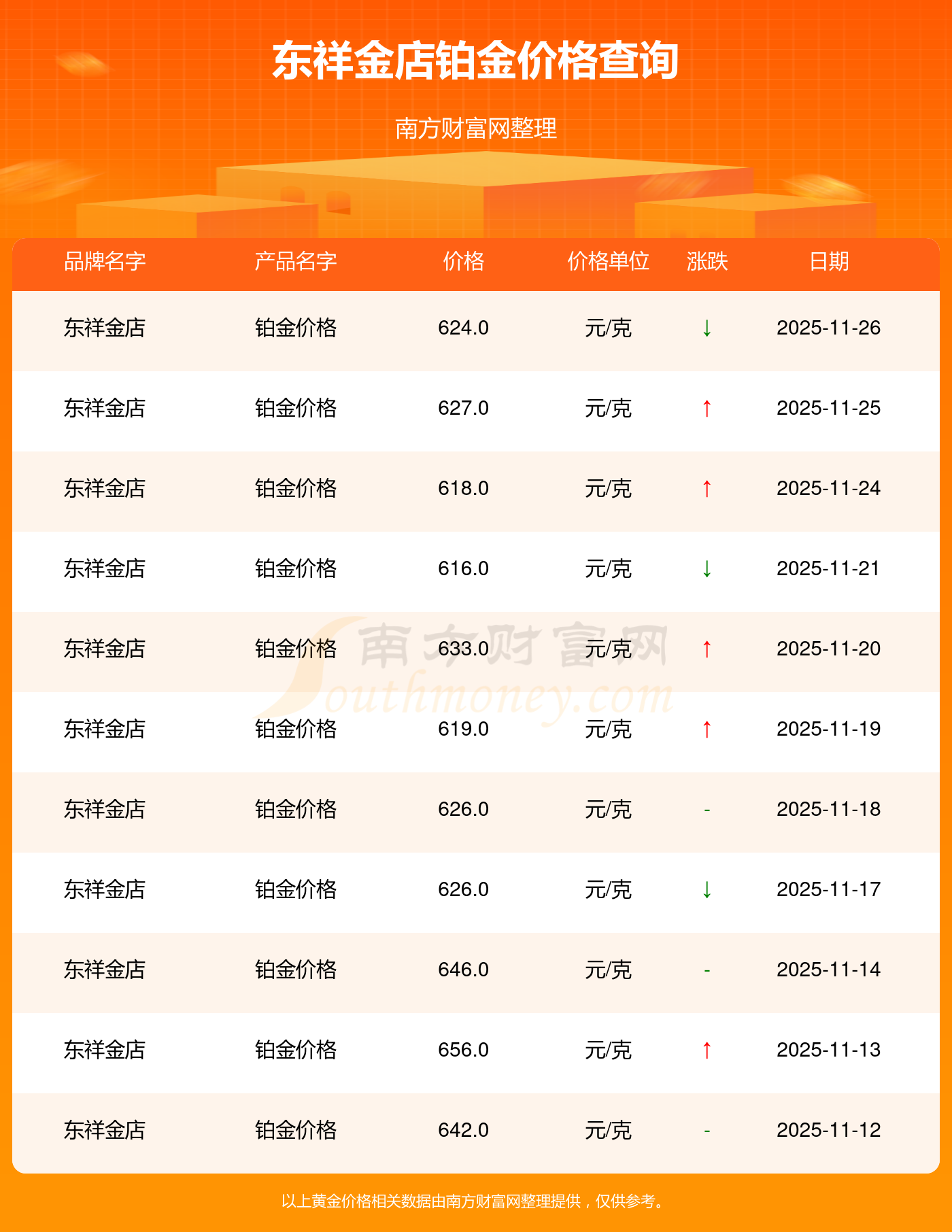 今日(2025年11月26日)東祥金店鉑金價格:624.0元/克。