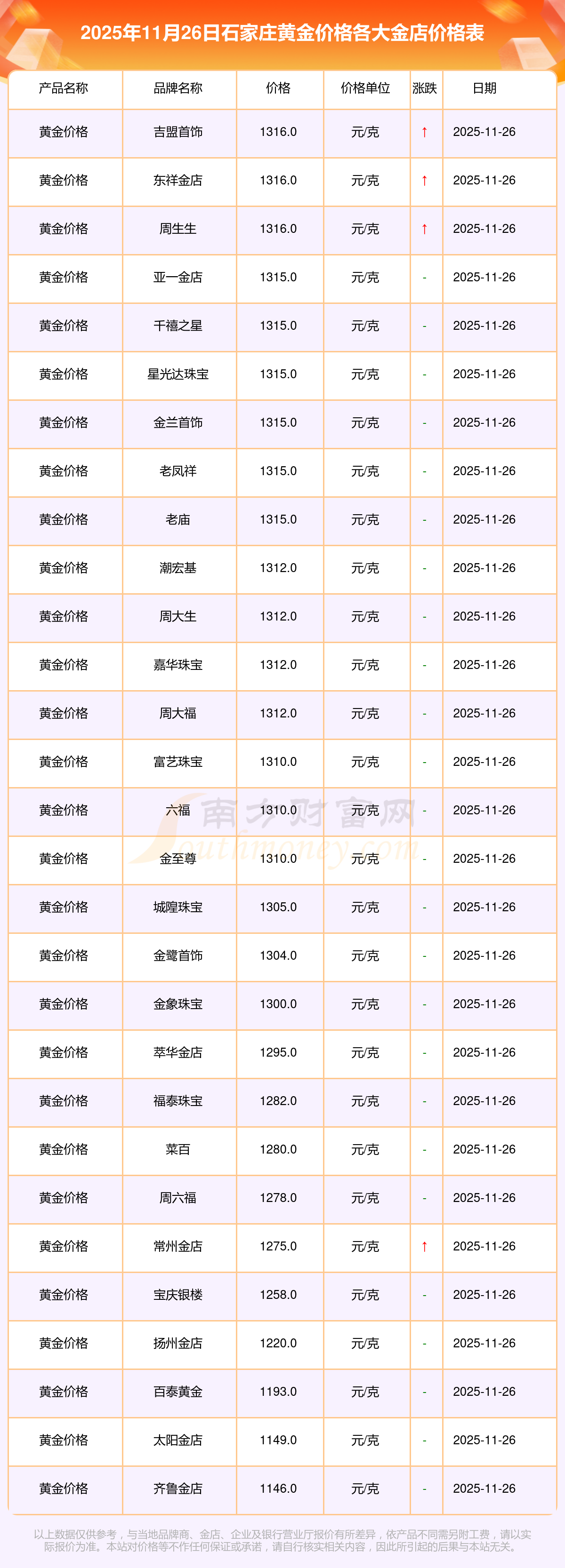 2025年11月26日,石家莊周生生、潮宏基、潮宏基、周大生、周大生、亞一金店、亞一金店、寶慶銀樓、寶慶銀樓、太陽(yáng)金店、太陽(yáng)金店等各大金店品牌黃金價(jià)格今日價(jià)格行情最新來了:周生生1155.0元/克、潮宏基1312.0元/克、潮宏基624.0元/克、周大生1312.0元/克、周大生624.0元/克、亞一金店1315.0元/克、亞一金店600.0元/克、寶慶銀樓1258.0元/克、寶慶銀樓368.0元/克、太陽(yáng)金店1149.0元/克、太陽(yáng)金店489.0元/克。