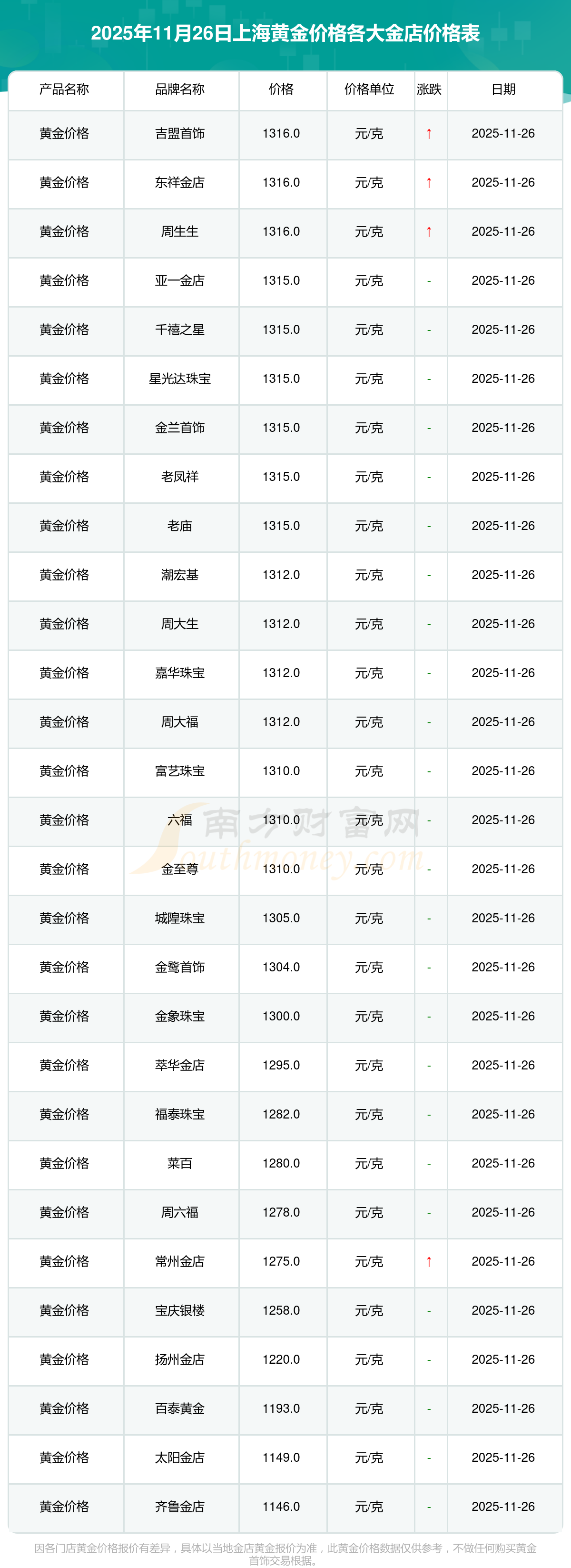 2025年11月26日上海周生生、潮宏基、潮宏基、周大生、周大生、亞一金店、亞一金店、寶慶銀樓、寶慶銀樓、太陽金店、太陽金店等各大金店品牌黃金價格最新價格如下:周生生金條金價(內(nèi)地)1155.0元/克,潮宏基黃金價格1312.0元/克,潮宏基鉑金價格624.0元/克,周大生黃金價格1312.0元/克,周大生鉑金價格624.0元/克,亞一金店黃金價格1315.0元/克,亞一金店鉑金價格600.0元/克,寶慶銀樓黃金價格1258.0元/克,寶慶銀樓鉑金價格368.0元/克,太陽金店黃金價格1149.0元/克,太陽金店鉑金價格489.0元/克。