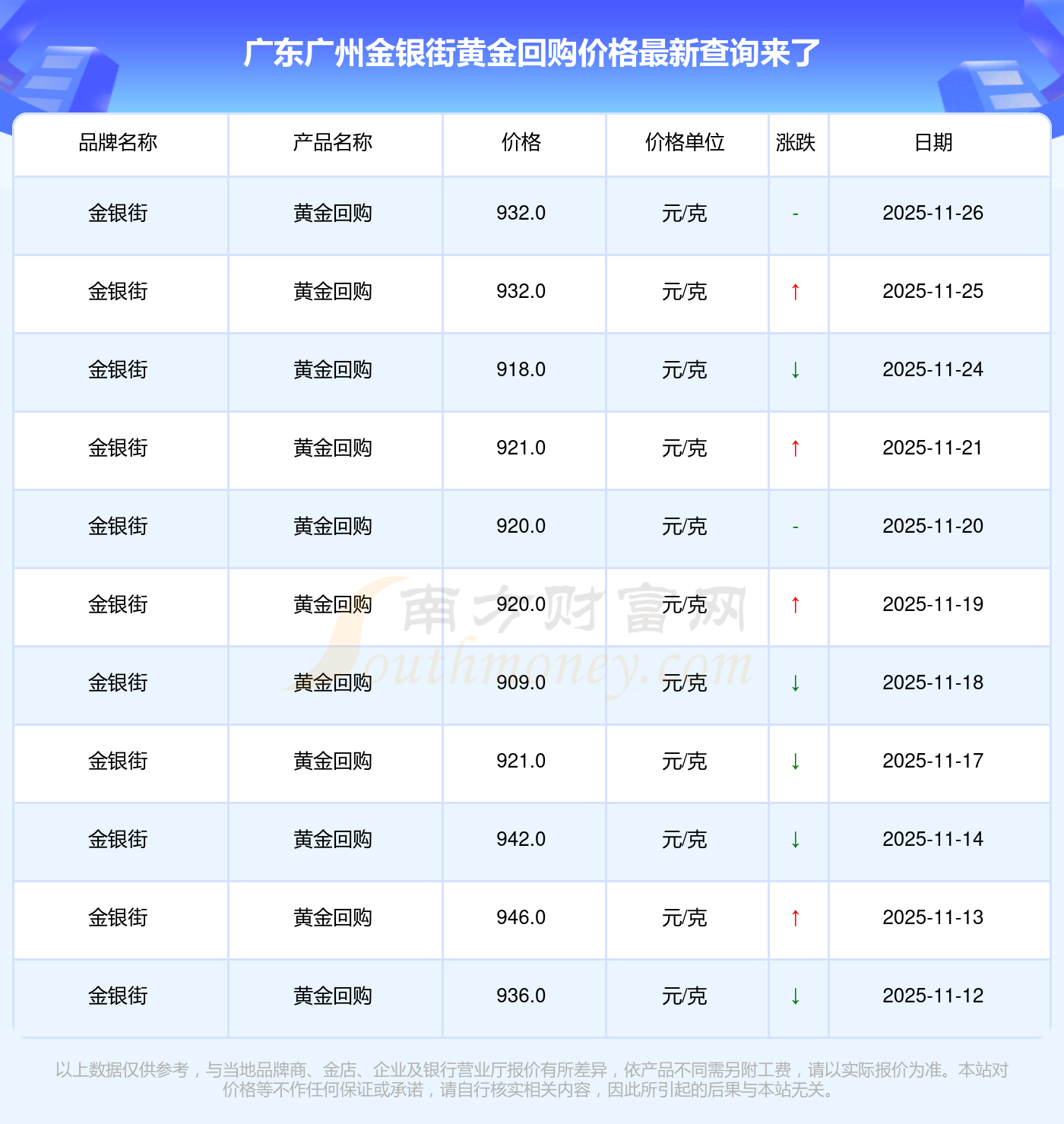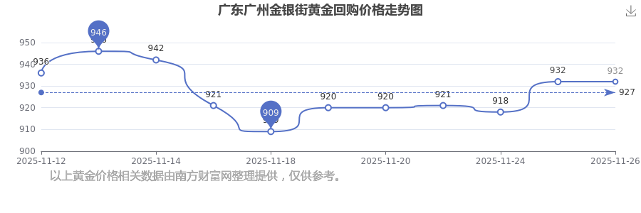 廣東廣州金銀街的黃金回購在今日(2025年11月26日),每克售價為932.0元/克。