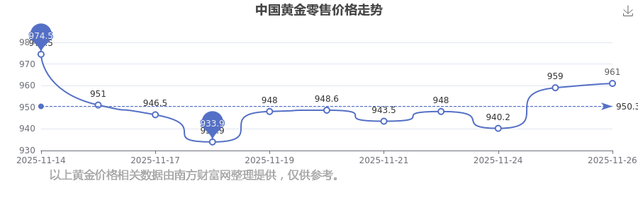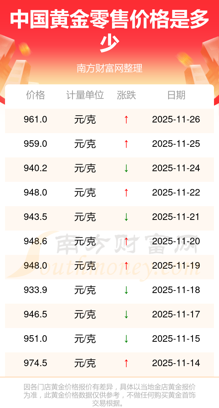 2025年11月26日中國(guó)黃金零售價(jià)格最新為961.0元/克。