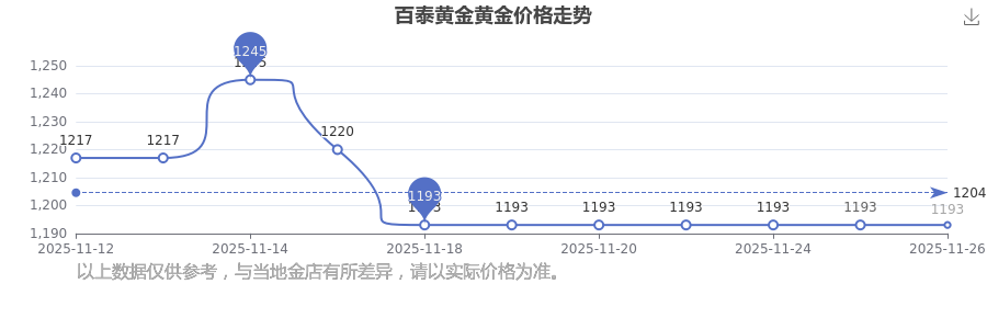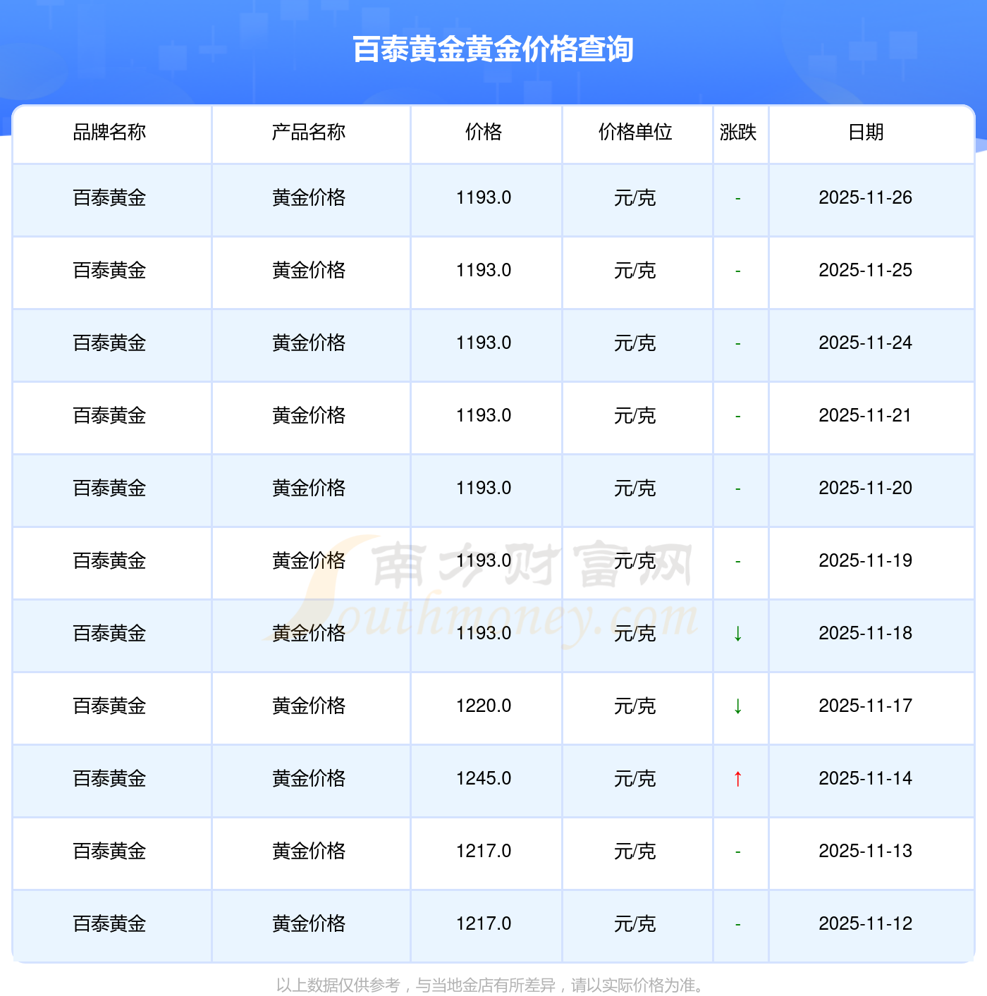 百泰黃金 黃金價(jià)格今日最新的價(jià)位是1193.0元/克。