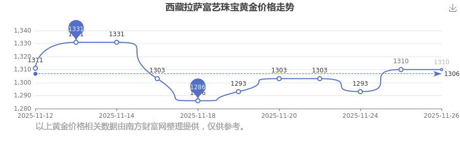 今日(2025年11月26日)西藏拉薩富藝珠寶黃金價(jià)格是1310.0元/克。