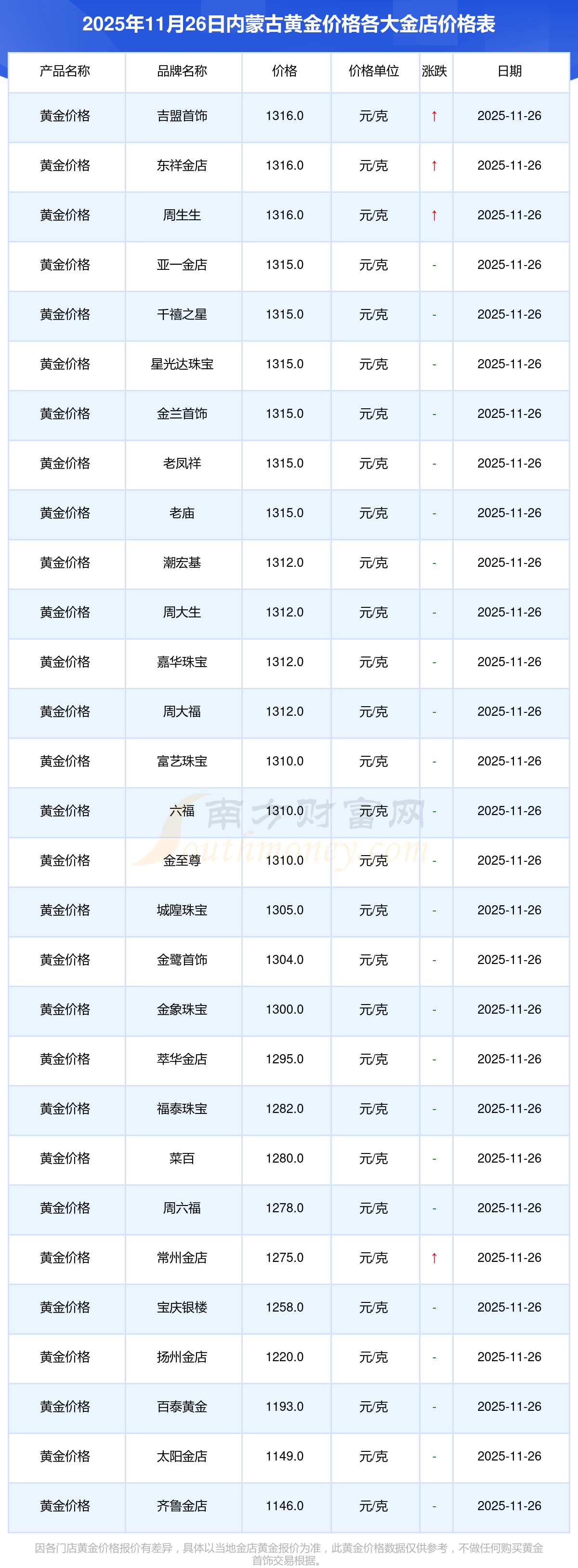 2025年11月26日內(nèi)蒙古周生生、潮宏基、潮宏基、周大生、周大生、亞一金店、亞一金店、寶慶銀樓、寶慶銀樓、太陽金店、太陽金店等各大金店品牌黃金價格最新價格行情來了,如下:周生生金條金價(內(nèi)地)1155.0元/克,潮宏基黃金價格1312.0元/克,潮宏基鉑金價格624.0元/克,周大生黃金價格1312.0元/克,周大生鉑金價格624.0元/克,亞一金店黃金價格1315.0元/克,亞一金店鉑金價格600.0元/克,寶慶銀樓黃金價格1258.0元/克,寶慶銀樓鉑金價格368.0元/克,太陽金店黃金價格1149.0元/克,太陽金店鉑金價格489.0元/克。