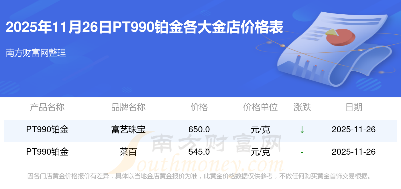今天是2025年11月26日,周生生、潮宏基、潮宏基、周大生、周大生、亞一金店、亞一金店、寶慶銀樓、寶慶銀樓、太陽金店、太陽金店等各大金店品牌PT990鉑金最新價(jià)格如下:周生生1155.0元/克、潮宏基1312.0元/克、潮宏基624.0元/克、周大生1312.0元/克、周大生624.0元/克、亞一金店1315.0元/克、亞一金店600.0元/克、寶慶銀樓1258.0元/克、寶慶銀樓368.0元/克、太陽金店1149.0元/克、太陽金店489.0元/克。