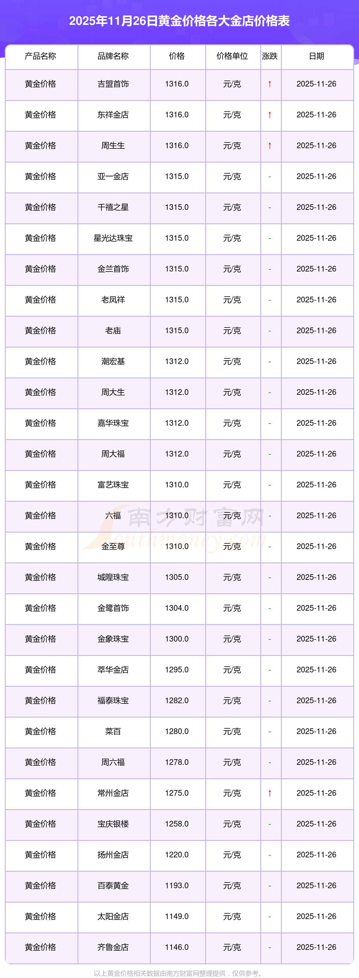2025年11月26日,周生生、潮宏基、潮宏基、周大生、周大生、亞一金店、亞一金店、寶慶銀樓、寶慶銀樓、太陽金店、太陽金店等各大金店品牌黃金價格今日價格如下:周生生1155.0元/克、潮宏基1312.0元/克、潮宏基624.0元/克、周大生1312.0元/克、周大生624.0元/克、亞一金店1315.0元/克、亞一金店600.0元/克、寶慶銀樓1258.0元/克、寶慶銀樓368.0元/克、太陽金店1149.0元/克、太陽金店489.0元/克。