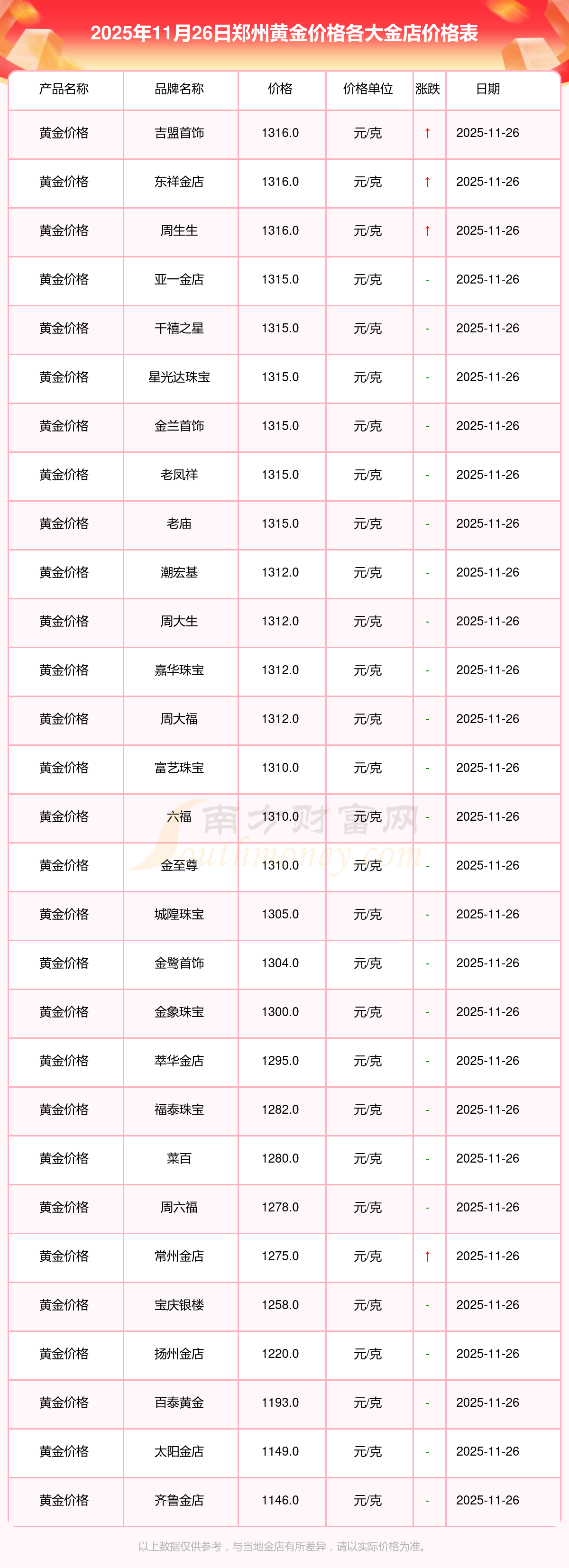 今天是2025年11月26日,鄭州周生生、潮宏基、潮宏基、周大生、周大生、亞一金店、亞一金店、寶慶銀樓、寶慶銀樓、太陽(yáng)金店、太陽(yáng)金店等各大金店品牌黃金價(jià)格最新價(jià)格如下:周生生1155.0元/克、潮宏基1312.0元/克、潮宏基624.0元/克、周大生1312.0元/克、周大生624.0元/克、亞一金店1315.0元/克、亞一金店600.0元/克、寶慶銀樓1258.0元/克、寶慶銀樓368.0元/克、太陽(yáng)金店1149.0元/克、太陽(yáng)金店489.0元/克。