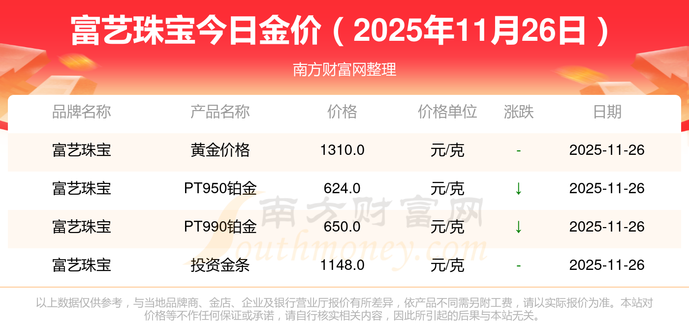 2025年11月26日富藝珠寶最新價格:金條金價(內(nèi)地)1155.0元/克,黃金價格1312.0元/克,鉑金價格624.0元/克,黃金價格1312.0元/克,鉑金價格624.0元/克,黃金價格1315.0元/克,鉑金價格600.0元/克,黃金價格1258.0元/克,鉑金價格368.0元/克,黃金價格1149.0元/克,鉑金價格489.0元/克。