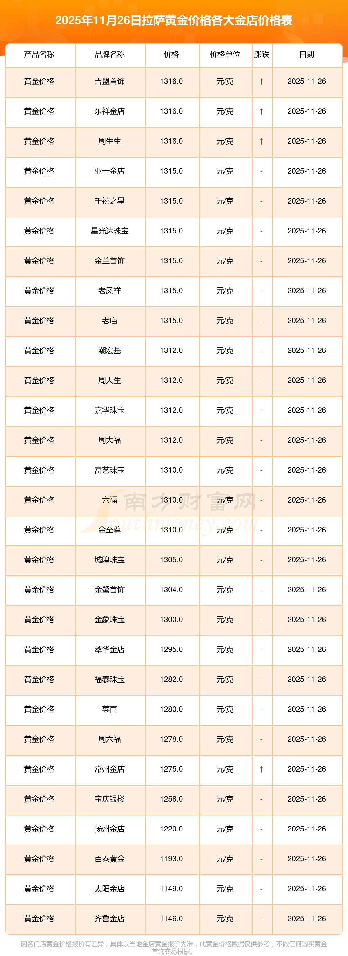 2025年11月26日,拉薩周生生、潮宏基、潮宏基、周大生、周大生、亞一金店、亞一金店、寶慶銀樓、寶慶銀樓、太陽金店、太陽金店等各大金店品牌黃金價(jià)格今日價(jià)格如下:周生生1155.0元/克、潮宏基1312.0元/克、潮宏基624.0元/克、周大生1312.0元/克、周大生624.0元/克、亞一金店1315.0元/克、亞一金店600.0元/克、寶慶銀樓1258.0元/克、寶慶銀樓368.0元/克、太陽金店1149.0元/克、太陽金店489.0元/克。