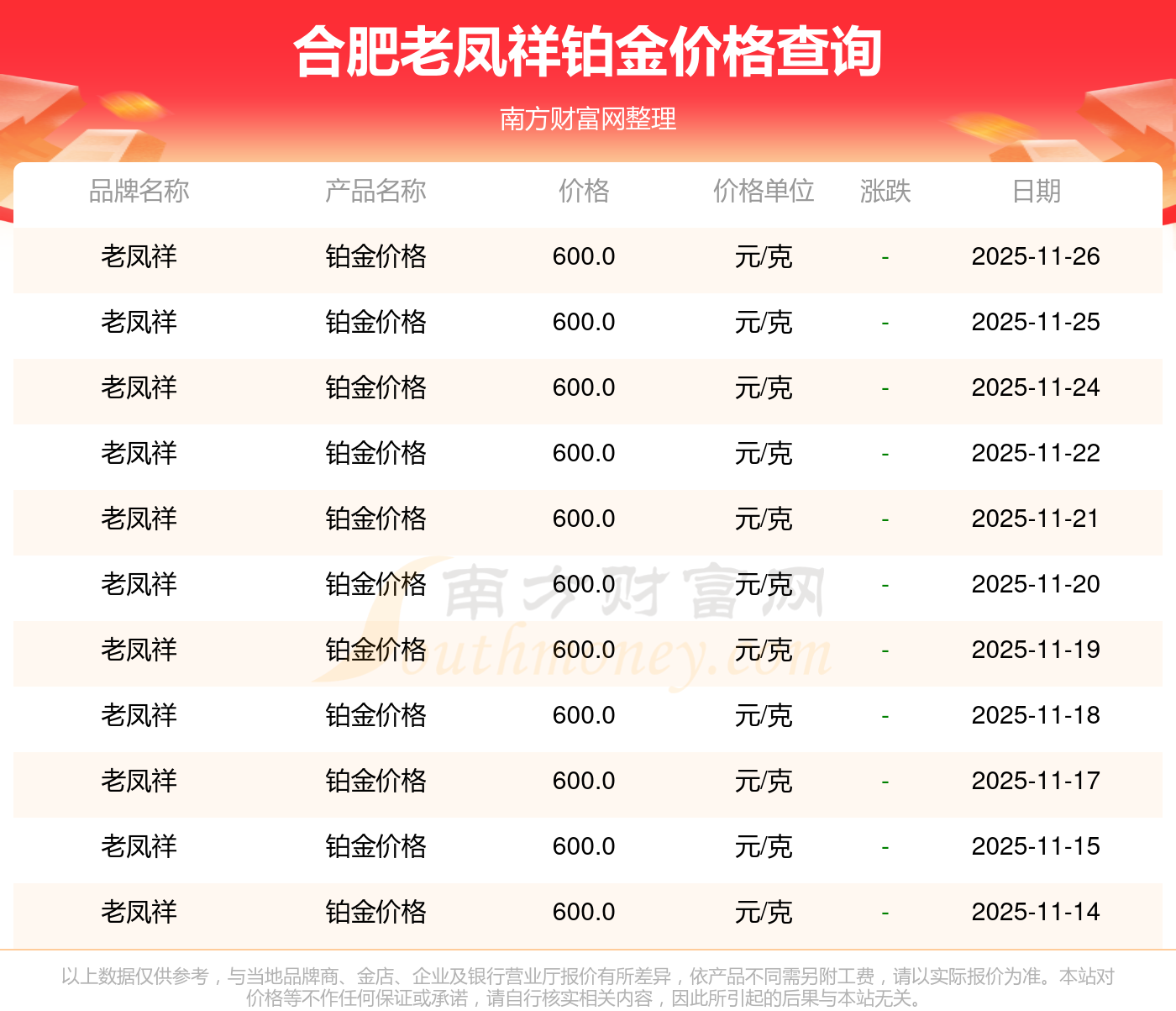 2025年11月26日合肥老鳳祥鉑金價(jià)格為600.0元/克。